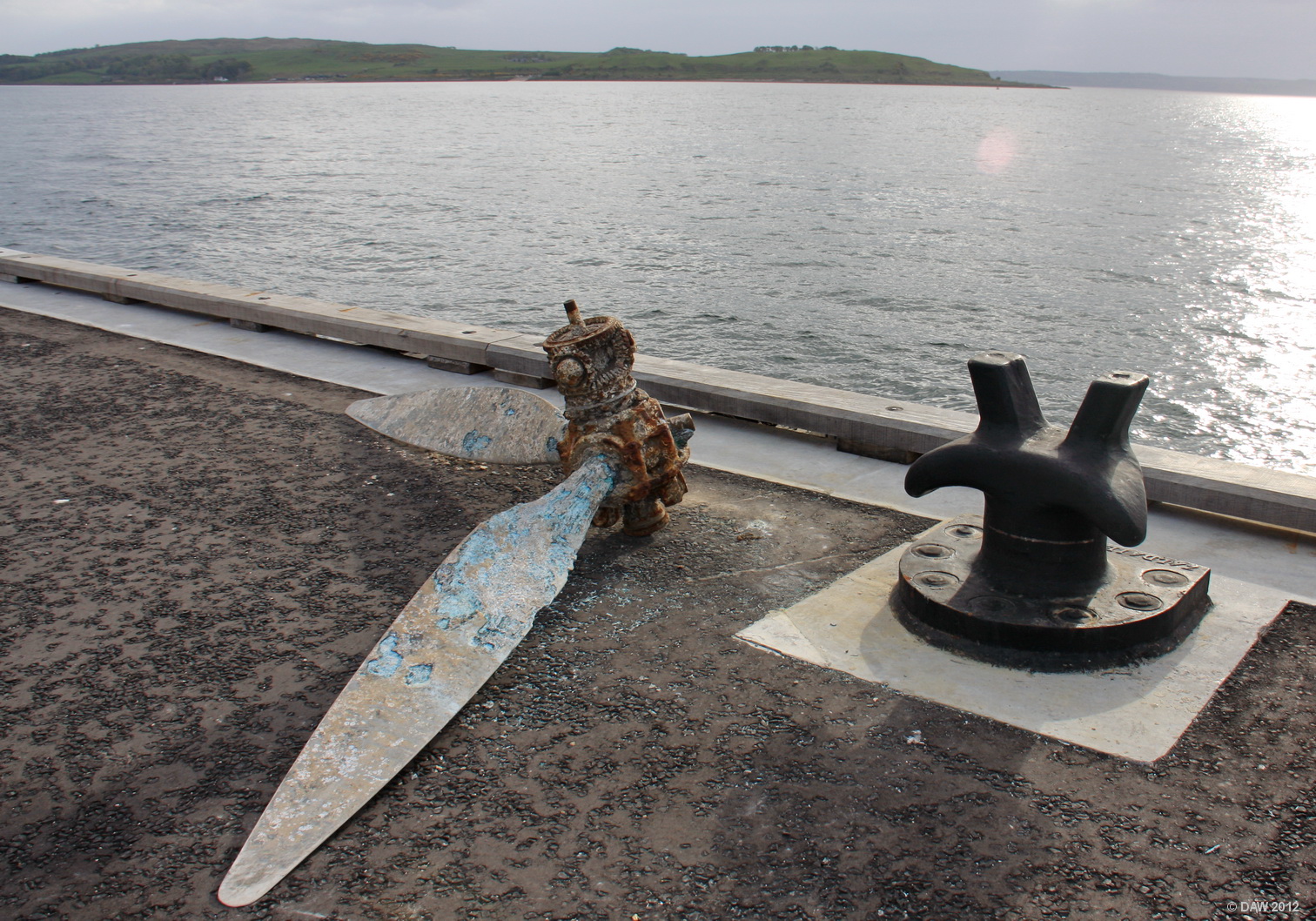 Photographed in May 2010, I can't remember the complete story but I think it was dragged up by a fishing boat. It looks like the three bladed propeller (one blade missing) from a Catalina flying boat. These aircraft were stationed at Largs during WWII.