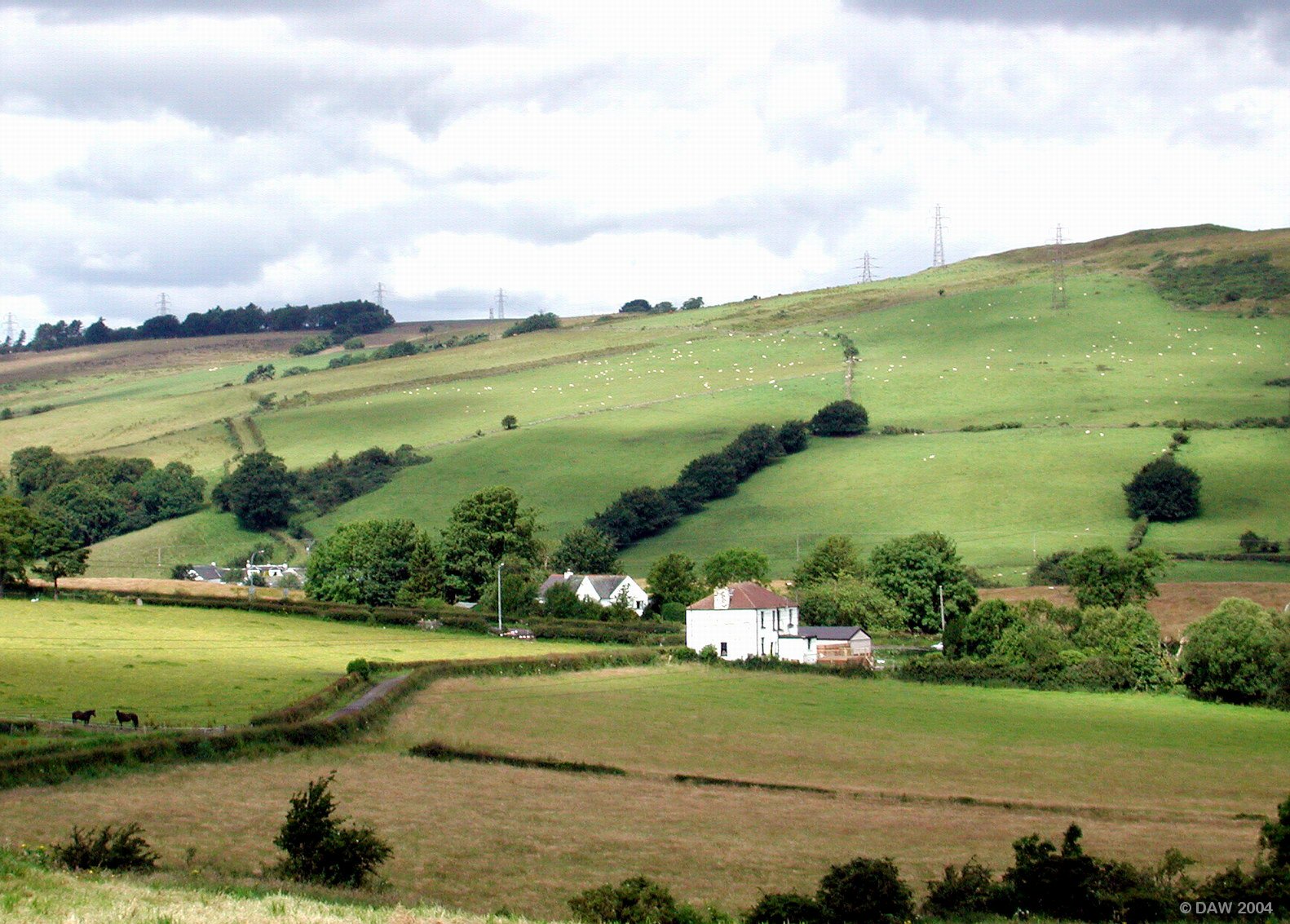 Neilston road runs along the centre of the picture with the Fereneze hills in the background, the white dots are sheep :-)