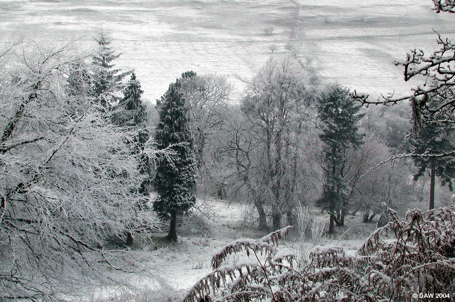 Former Grounds of Cowden Hall in winter time. The tree on the left is the large copper beech featured in another picture.