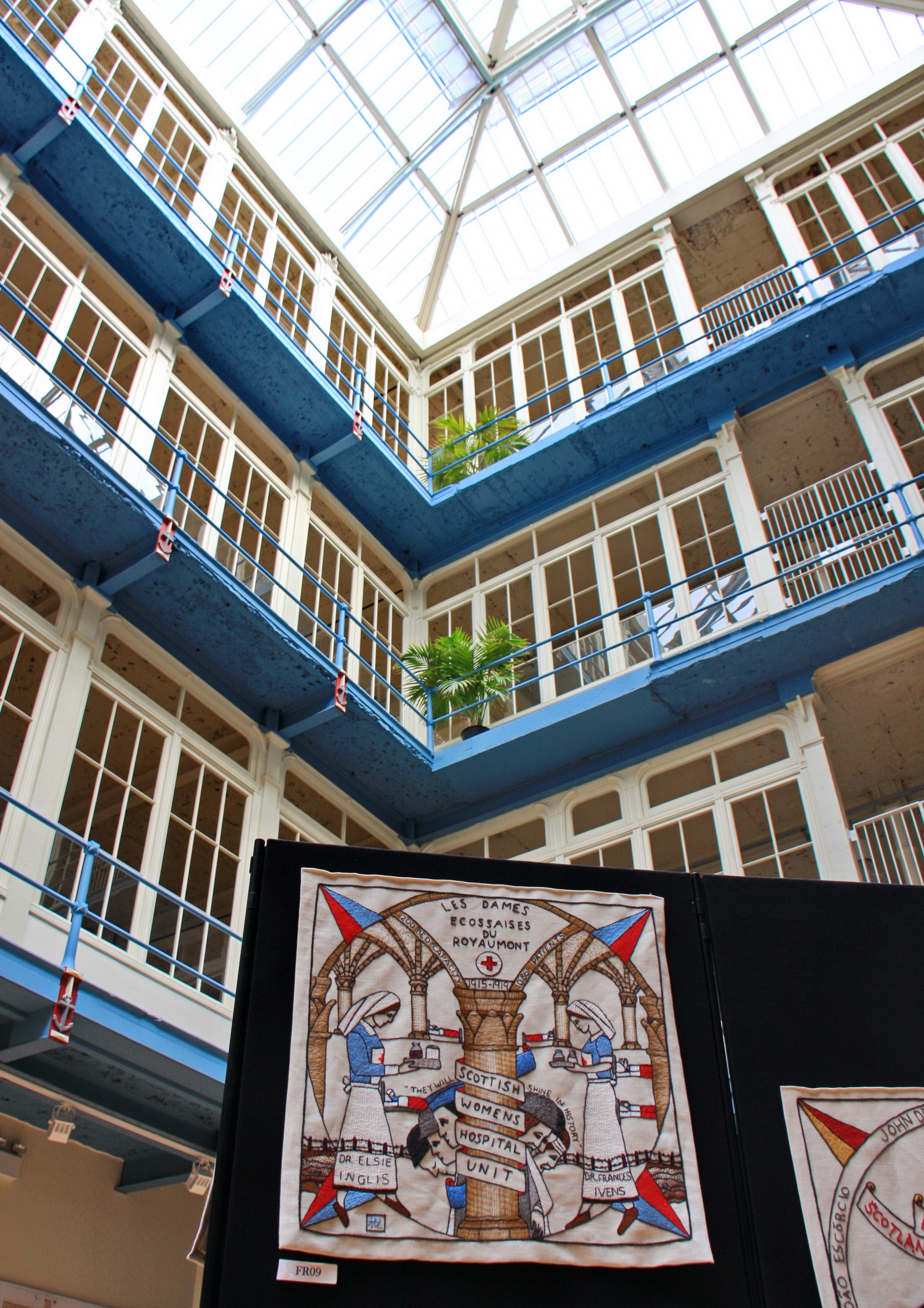 The Diaspora Tapestry of Scotland is a depiction in embroidered panels of Scotland's links and influence throughout the world.  Seen here on display at the Anchor Mill in Paisley.  This panel celebrates the Scottish Women's Hospital unit in France during WWI.