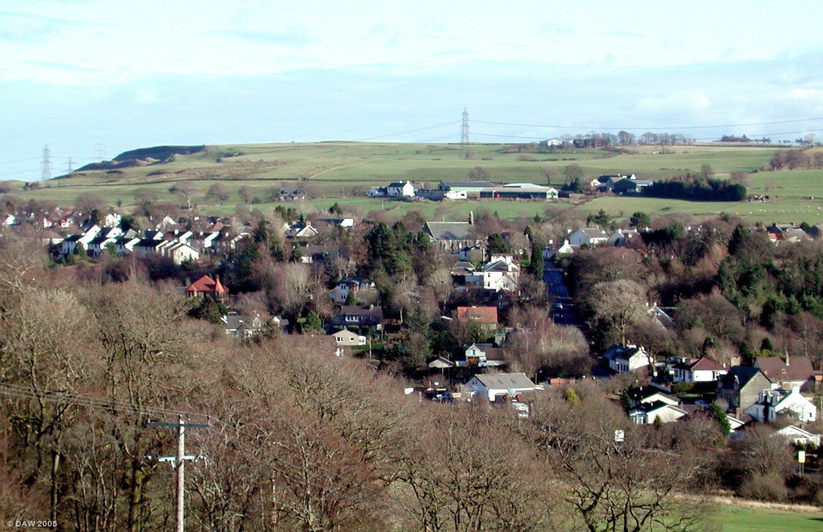 A winter view of Uplawmoor from the top window of Caldwell Tower.