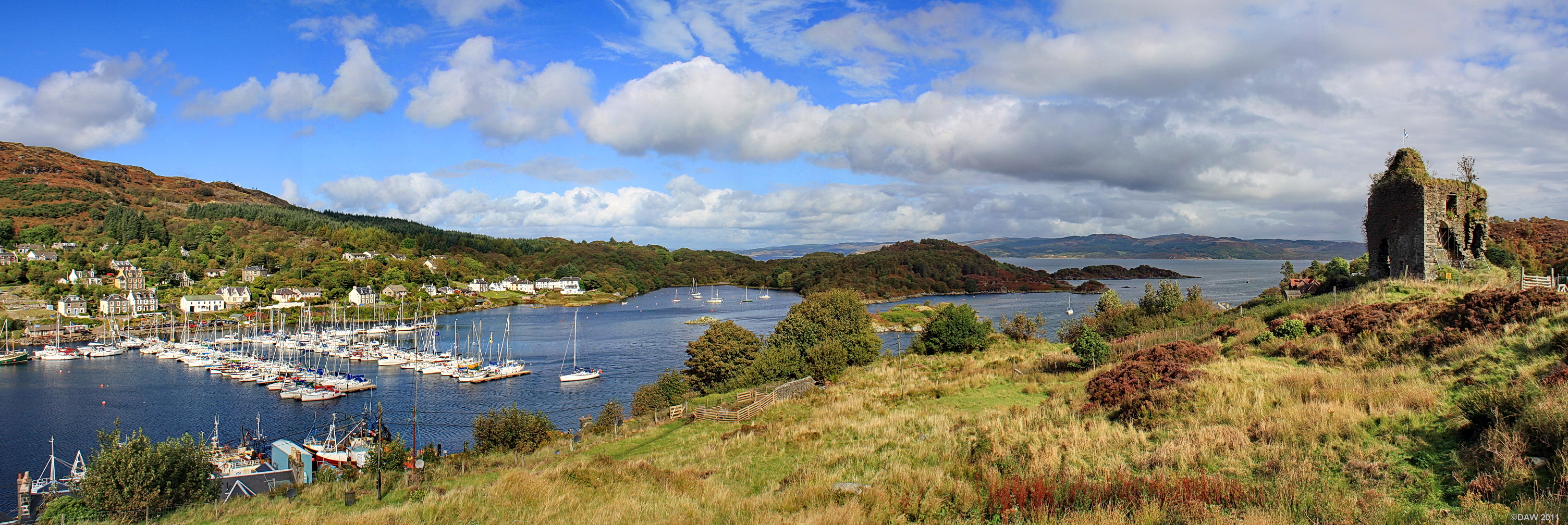 The ruins of Tarbert Castle stand above Tarbert harbour on East Loch Tarbert. What stands today dates from around 1494 but there has been a castle on the site long before then. Robert the Bruce fortified the building in 1320's to protect against the Lord of the Isles. Map location.