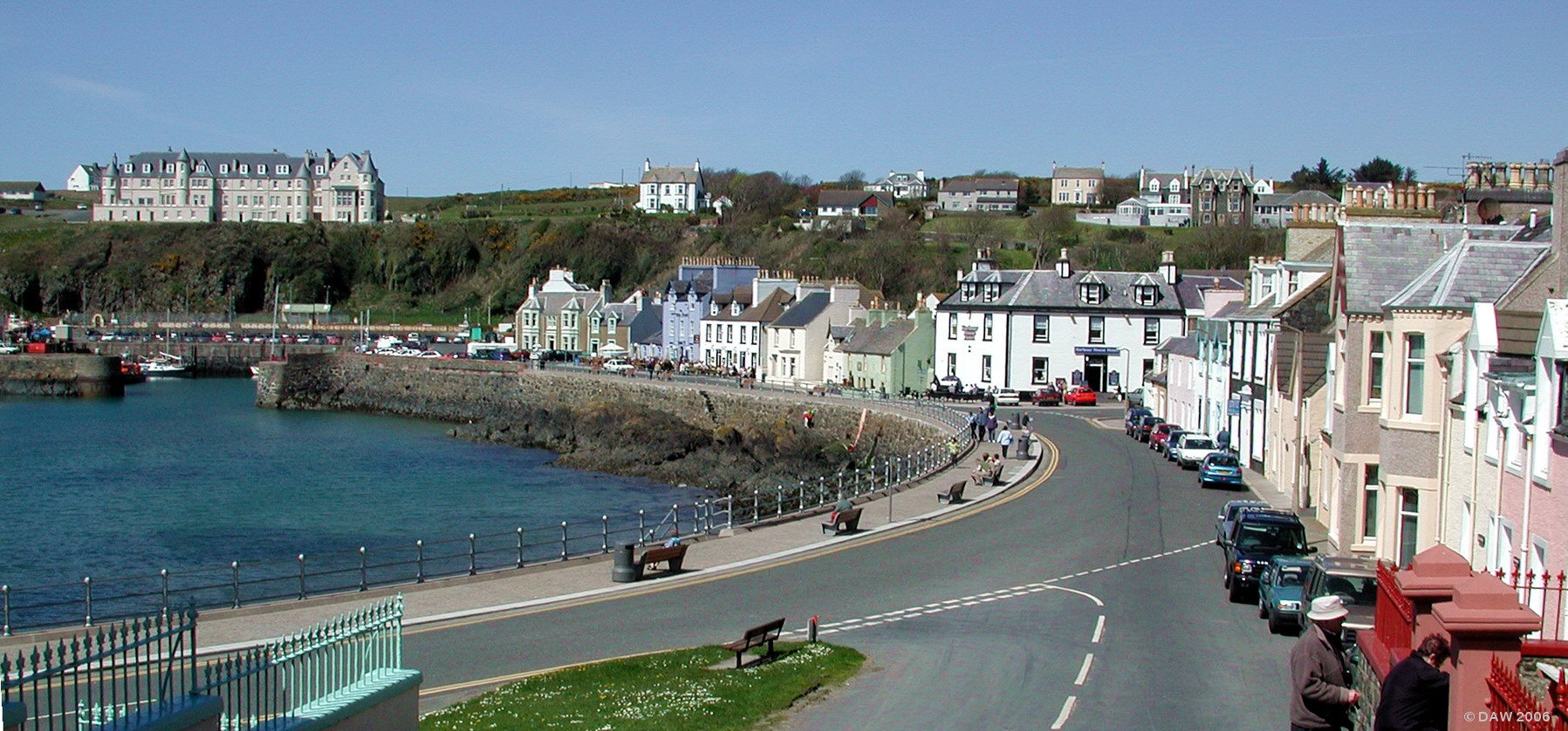 A view along the water front at Portpatrick. The building on top of the cliff is