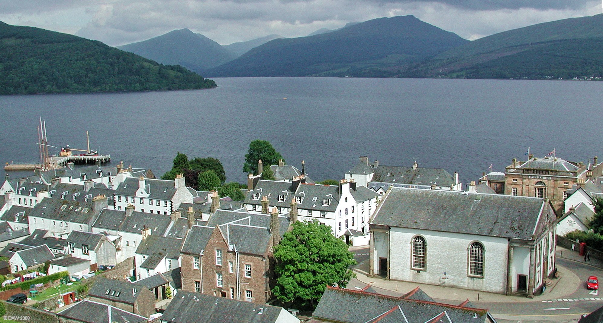 The large white building on the right is Glenaray and Inveraray Parish Church, it used to have a stone spire in the centre of the roof but this was removed in 1941 after concerns that it was unsafe with the vibration of heavy traffic passing close by. The sandstone building behind the Church is the old Jail, now a museum. Map location