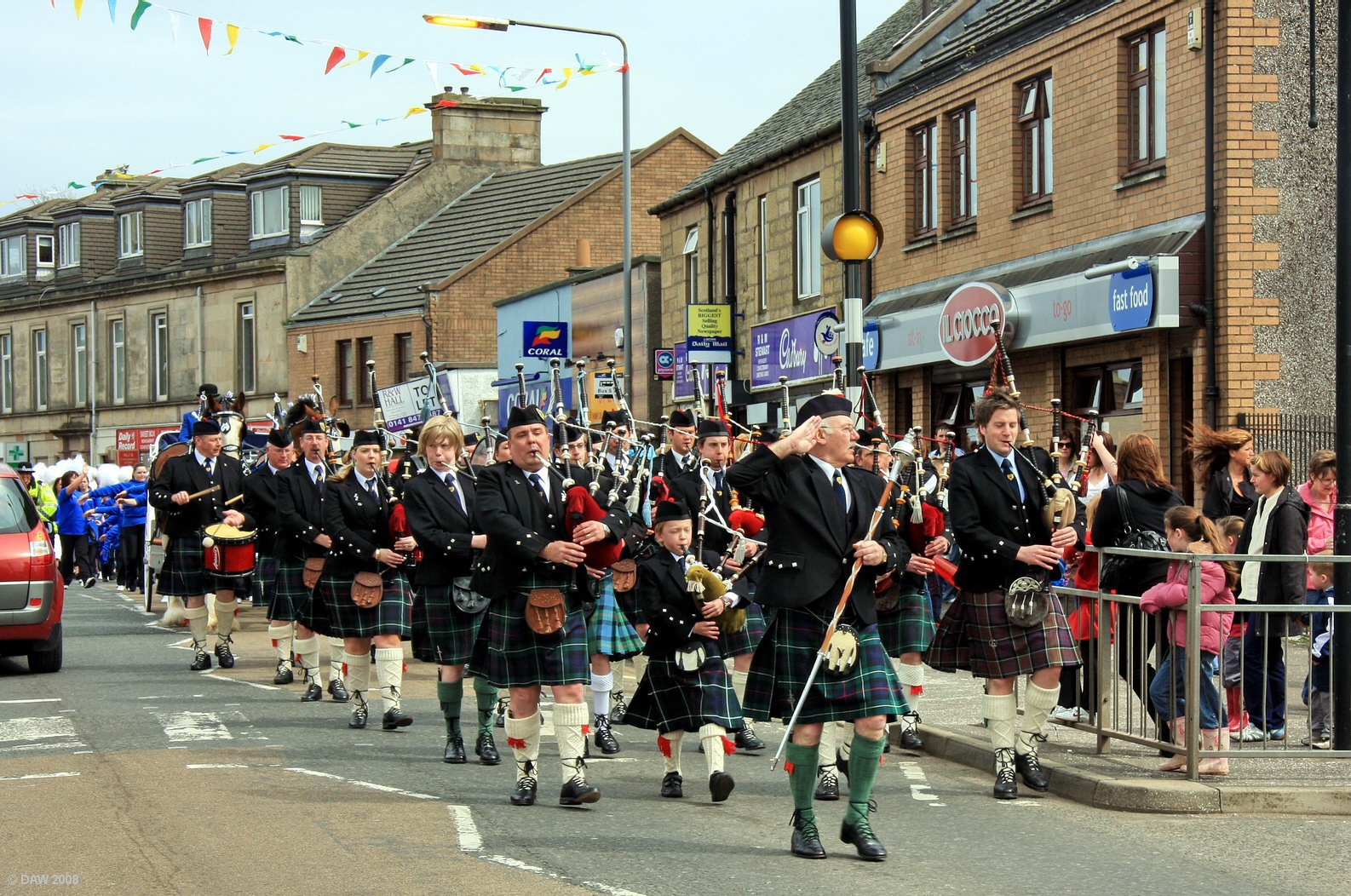 Pipe Major Ian MacDonald takes the salute as he leads the Neilston & District Pipe band, followed by the parade, through the village to the show ground.