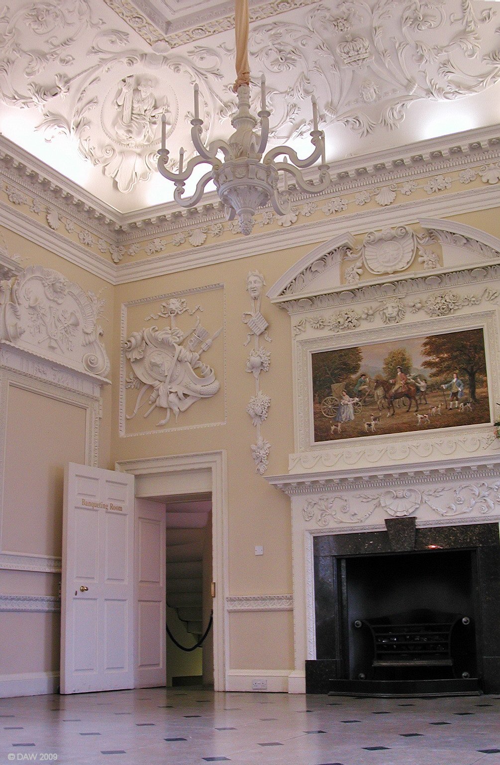 A view of the impressive plaster work inside Chatelherault Hunting Lodge. Built in 1734 but gutted by fire in the 1940's it remained a vandalised ruin until the early 80's when it was restored by Historic Scotland to its former glory. Today it is run by South Lanarkshire Council as a visitor attraction along with the large estate around it. Map location.