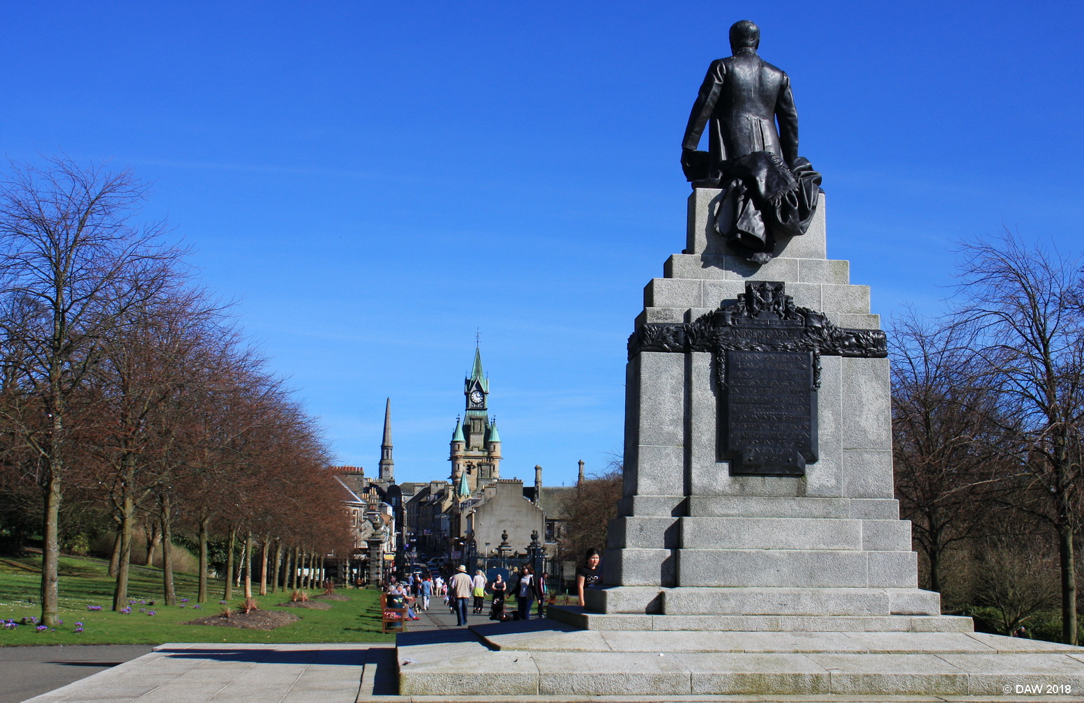 The Statue of Andrew Carnegie faces out of Pittencrieff Park towards the High Street of Dunfermline.