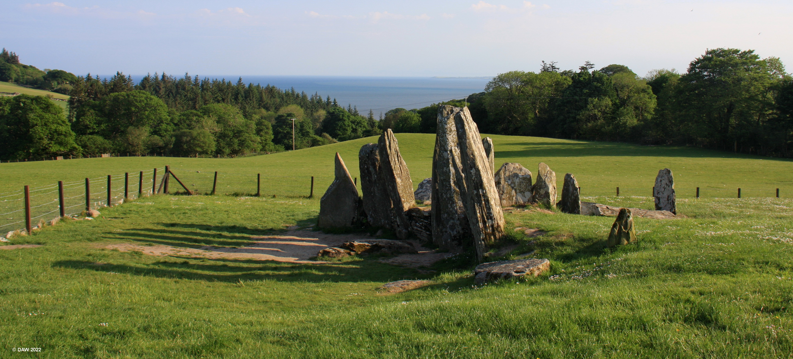 The evening sun casts shadows at Cairnholy Chambered Tomb on the gently sloping hills above Kirkdale Glen. The tomb dates from between 4,000 and 6000 years ago. The curving facade of standing stones form a backcloth to a forecourt in front of the tomb and it is tempting to this tomb as a focus for ceremonies.