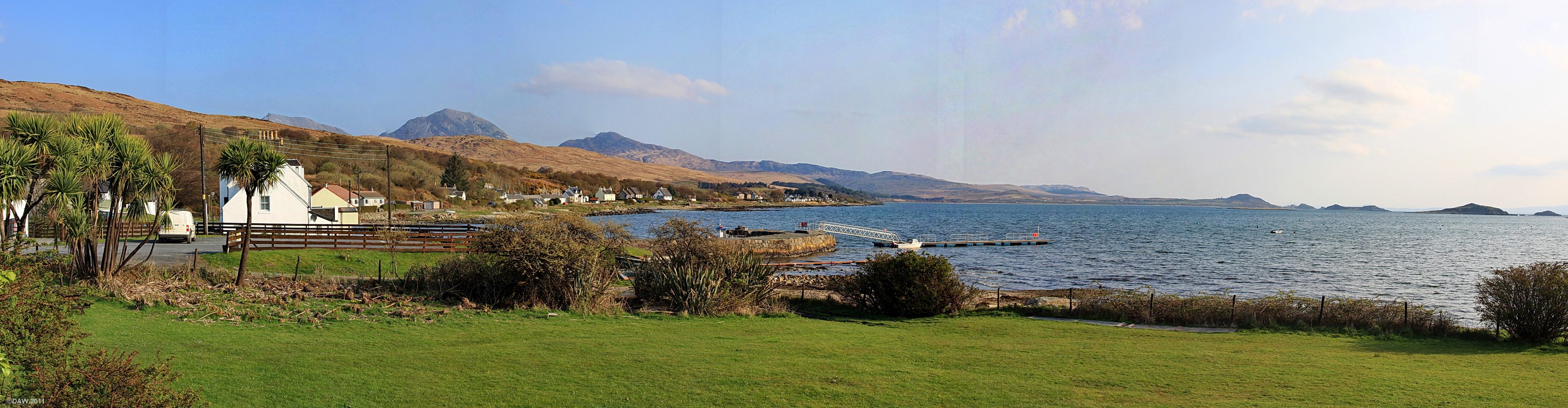 An early morning view looking out from in front of the Jura Hotel. The white building on the left beihind the palm trees is the Jura Store. In the distance you can see the Paps of Jura and on the right are The Small Isles.