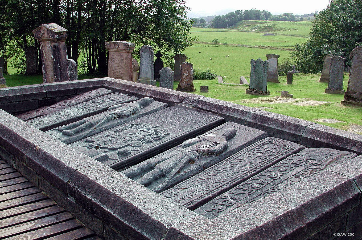 Kilmartin Churchyard has the largest collection of medieval carved slabs in the west Highlands. They date from the 14th and 15th century, there are more under cover and they are all free to view all year round. In the distance one of the many pre-historic burial cairns of the area can be seen
