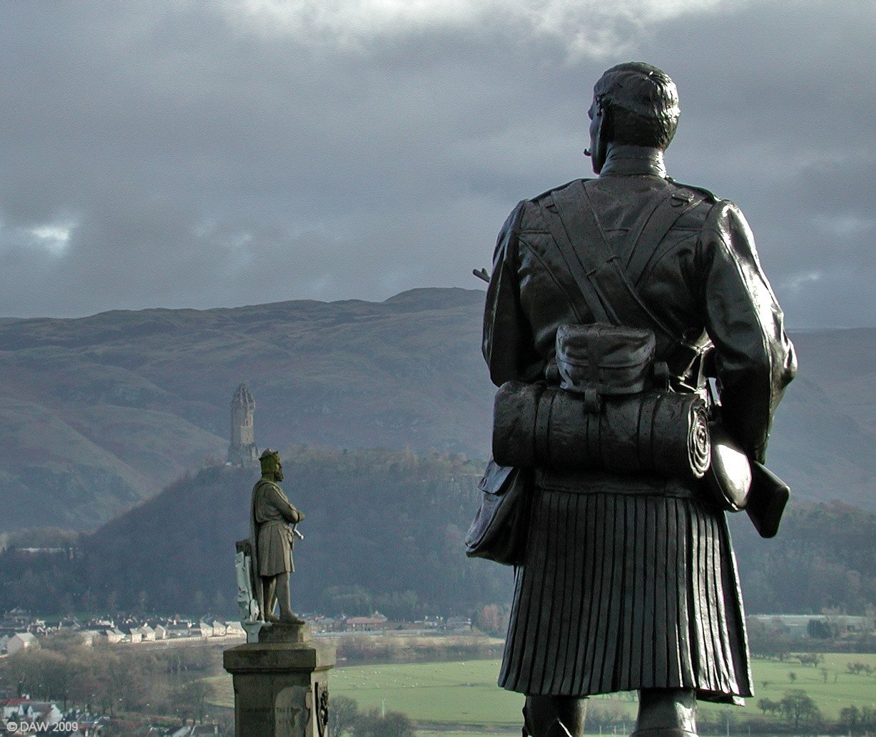 The kilted soldier is a war memorial to soldiers of the Argyle & Sutherland Highlanders who lost their lives in the Boer war of 1899 to 1902.  The distant figure is that of Robert the Bruce and on the hill that is the Wallace Monument to commemorate William Wallace.  [url=http://www.streetmap.co.uk/map.srf?X=278965&Y=694056&A=Y&Z=120/] Map location. [/url]