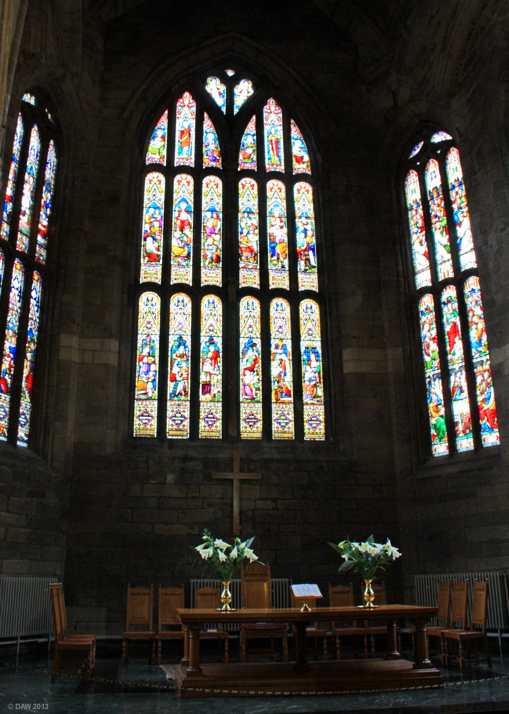 Stained glass windows above the communion table at the Church of Holy Rude near Stirling Castle.