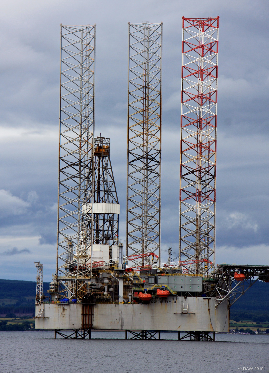 The Cromarty Firth forms a huge natural harbour area, it was used in the past as an anchorage by the Royal Navy. Today it is common to see Oil rigs of all sorts either laid up or undergoing re-fit. This particular one is a jack-up rig, when raised the legs tower some 560ft above the rig. Map location.
