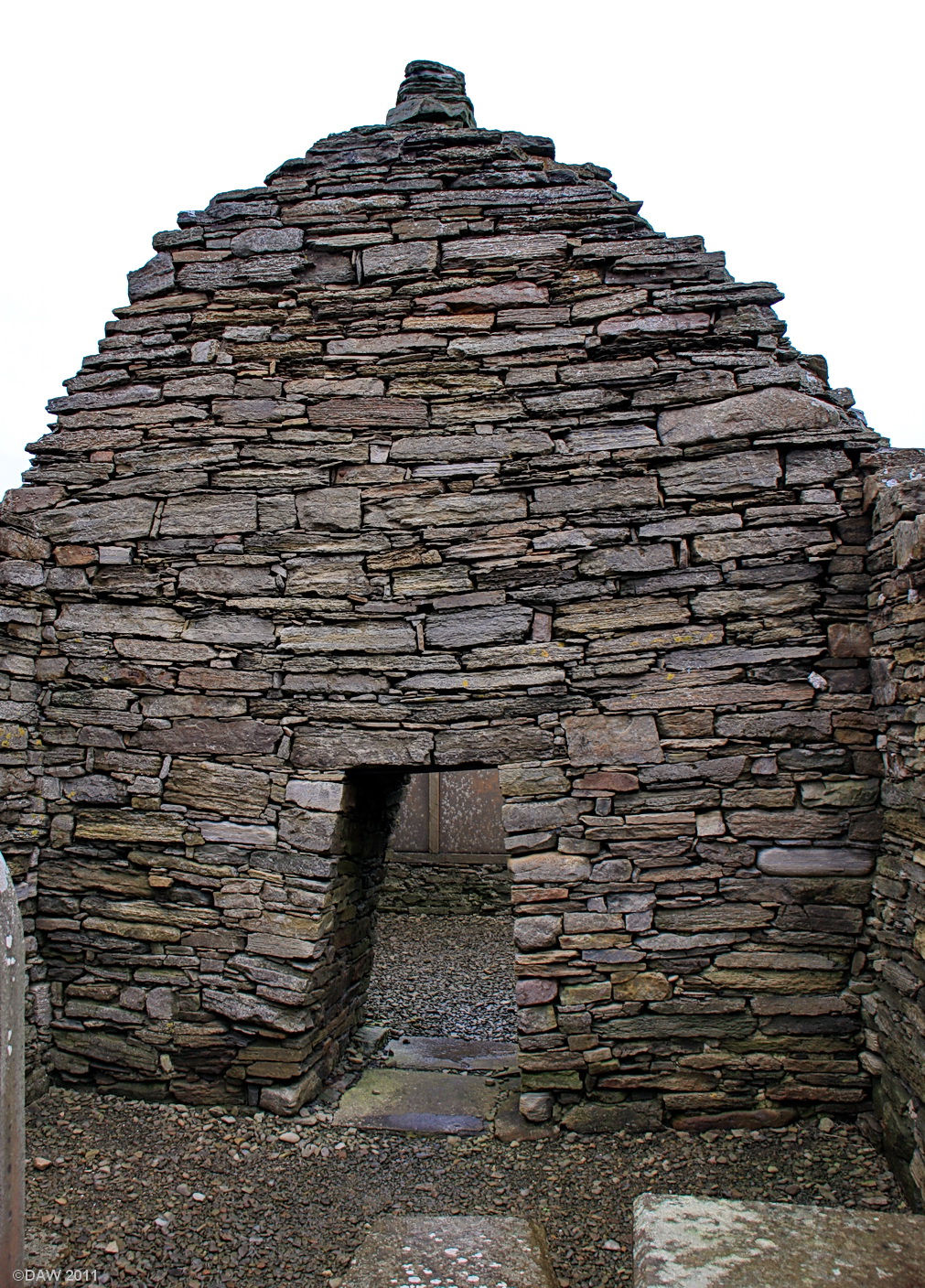Looking from the Nave to the Chancel at St Mary's Chapel. The division between the two is typical of Norwegian stone Chapels of the time rather than Scottish ones. The converging door sides are a feature also found in early Irish Churches. Map location.