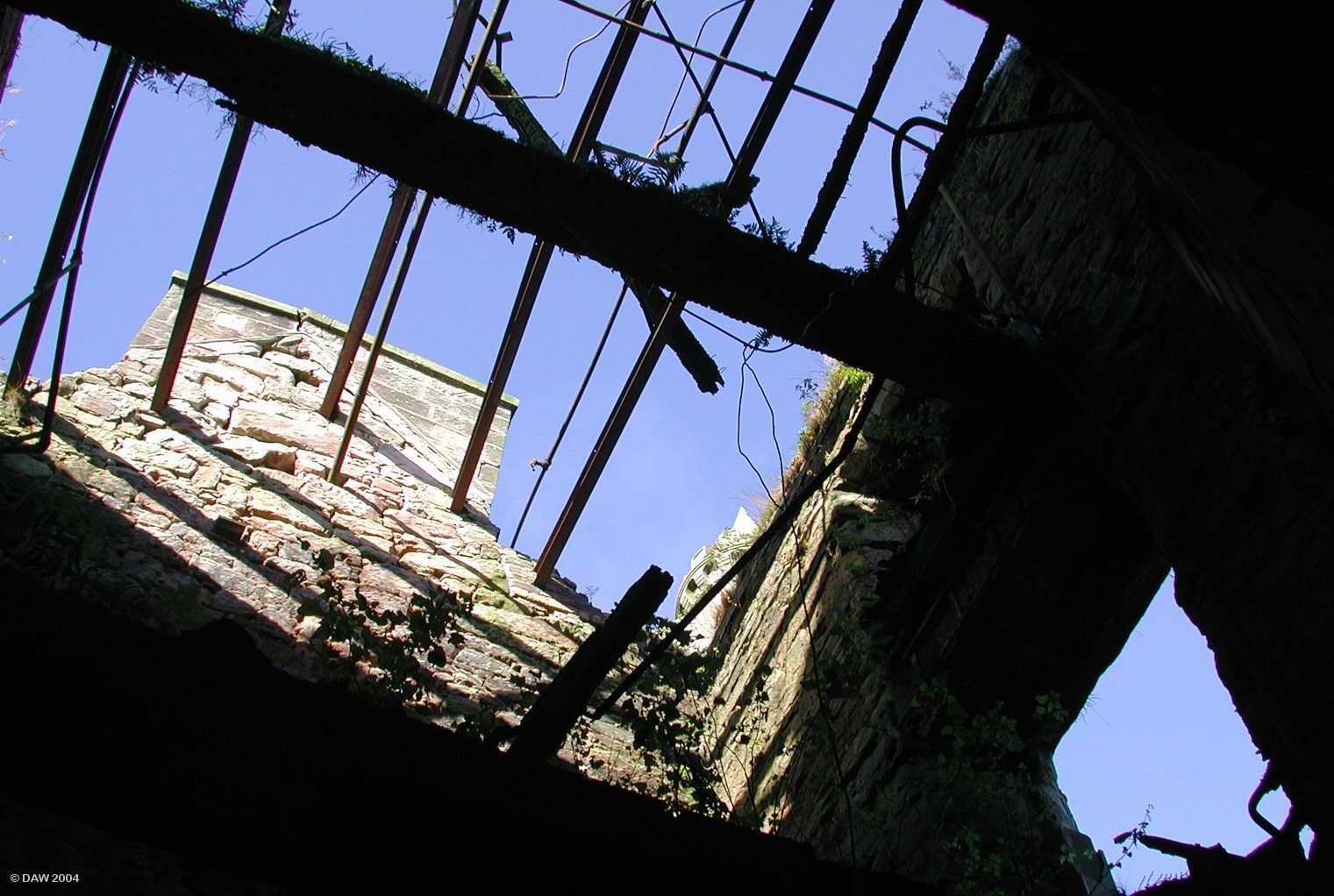 This Categary A listed building is now in a critical condition, the northern end being the worst, this view from the ground floor shows the two floors above and the roof have gone. There appear to be steel beams which have withstood the fire and are probably all that is holding it together.