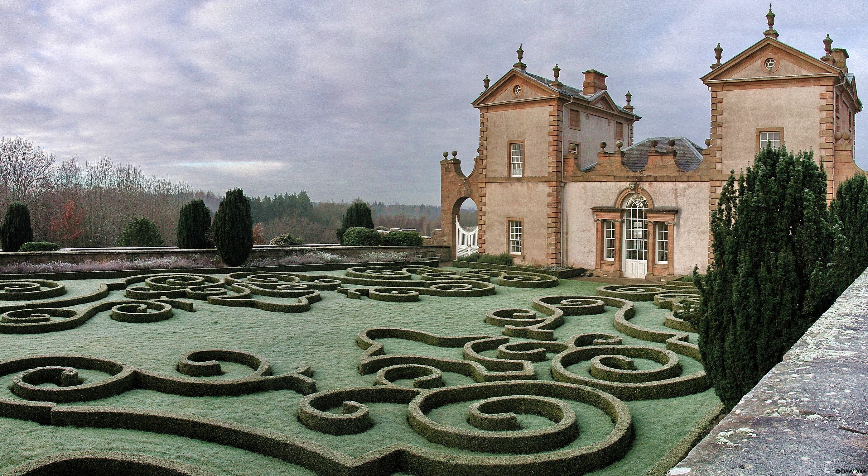 A hard frost gives extra contrast to show the impressive box hedge designs at Chatelherault. The building dates from 1743 and was built as stables and kennels for the 5th duke of Hamilton who's Palace stood nearby. The Palace has since been demolished and this building was gutted by fire in 1940's. After being given to the nation it was restored by historic Scotland to its former glory between 1978-87 and today is open to the public with a small visitor centre at the rear.
