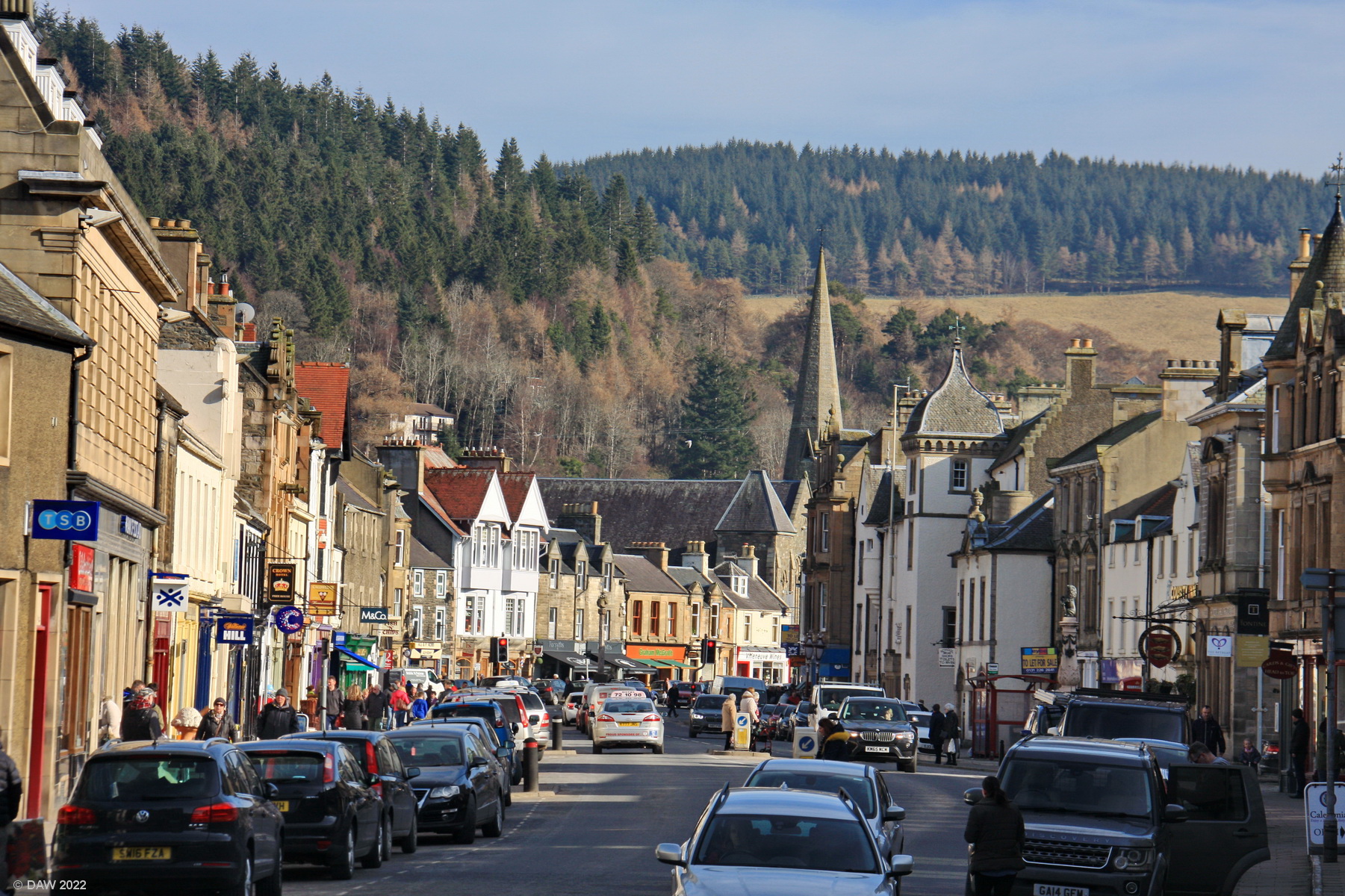 A view down the busy main street of the small borders town of Peebles.