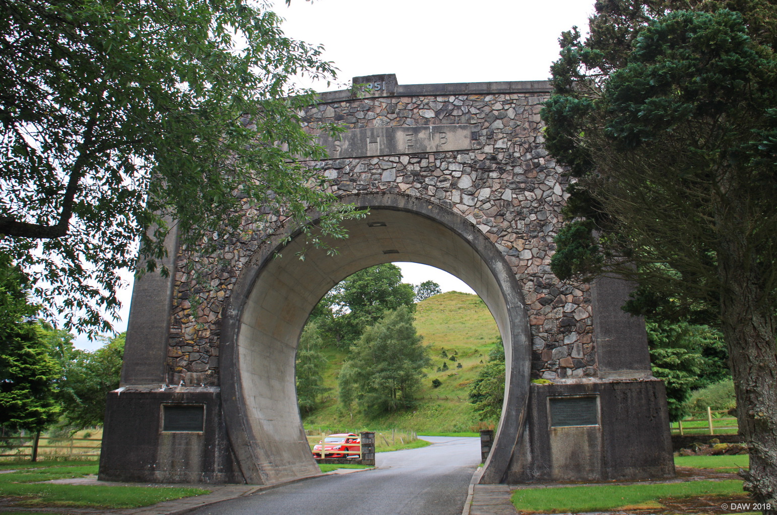 The Arch honours men who died when building a tunnel to Clunie power station in the late 1940s. It measures 6.9m across, the same diameter as the tunnel. The Clunie dam and power station are part of the Tummel Valley Hydro Electric scheme. Map location.