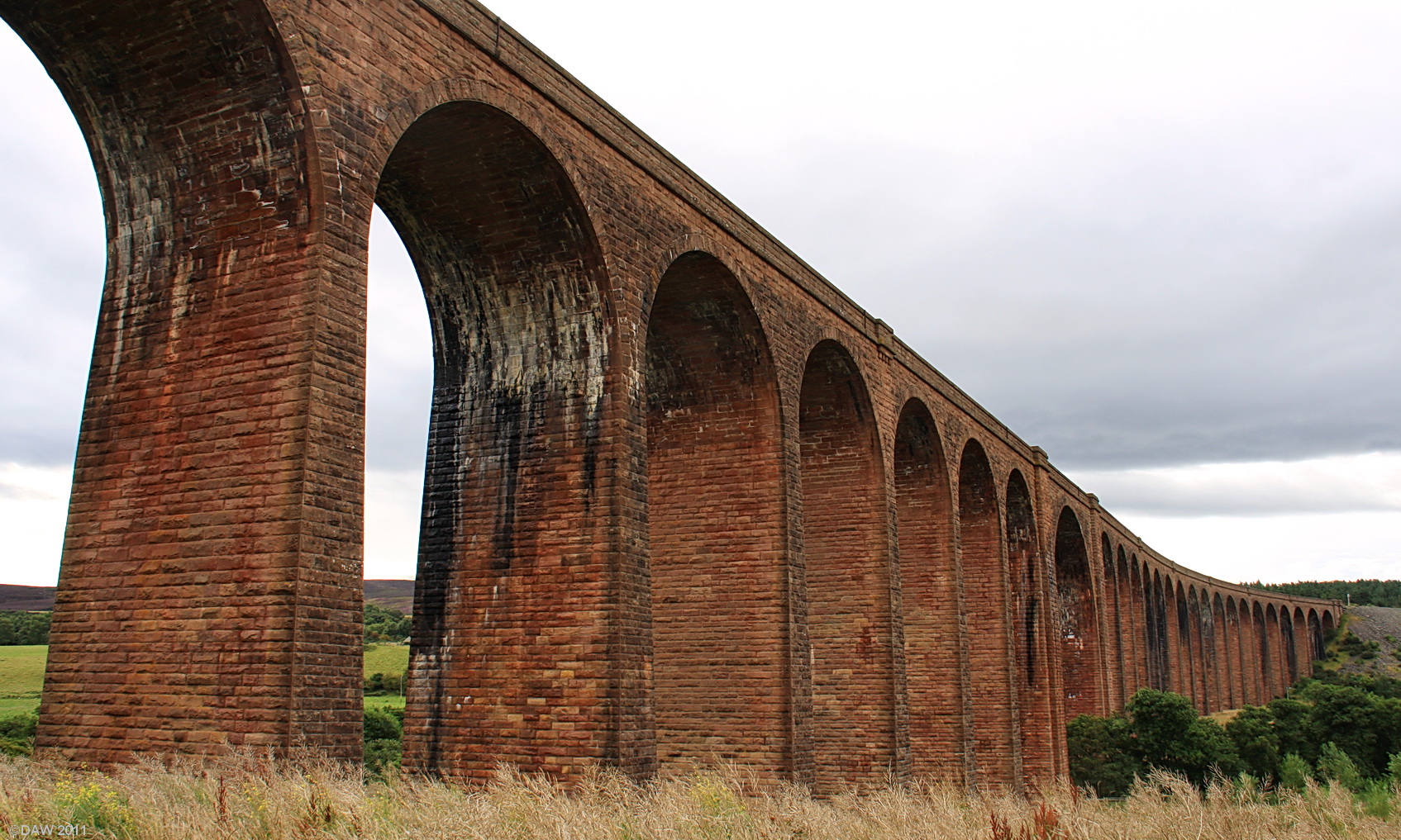 This impressive 28 span viaduct is the longest such masonry bridge in Scotland. It was built in 1898. It was designed by Murdoch Paterson for the Highland Railway and crosses the River Nairn on a curve with a span on some 549m. The bridge is still in use today. Map location.