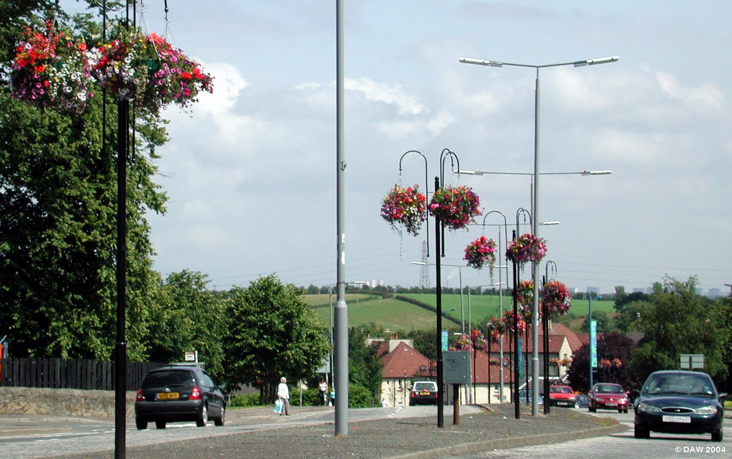 A blaze of summer colour on the main dual carraigeway through Barrhead, summer 2004. The lower trees on the left is where the Levern Mill once stood.