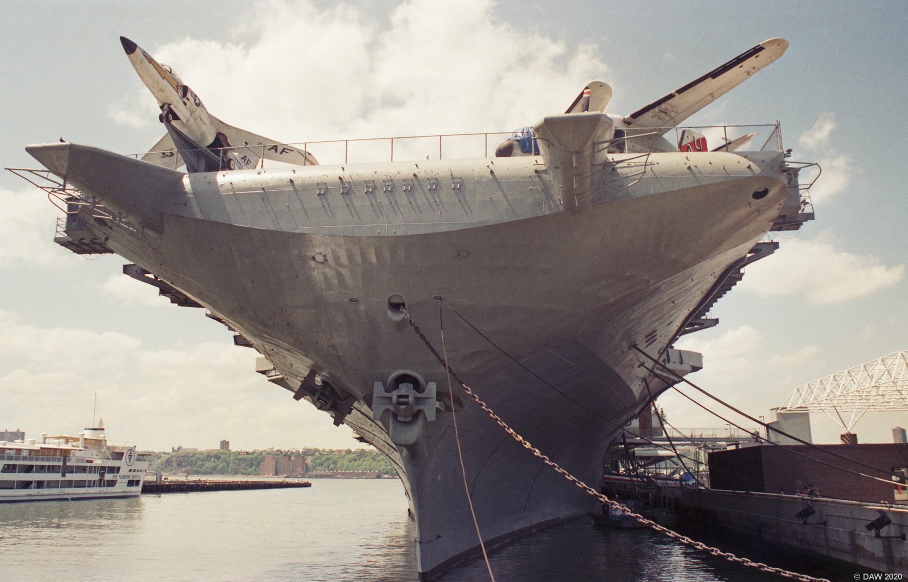 A view of the "hurricane bow" of USS Intrepid. Intrepid is a WWII Essex class Aircraft Carrier of the US navy and was first commissioned in 1943. She was built with an open bow to accomodate anti-aircraft turrets but during a 1950's re-fit these were removed and the bow you see today added along with the angled flight deck. Today Intrepid is the Intrepid Air & Space Museum and is permanently anchored on the Hudson at New York City.