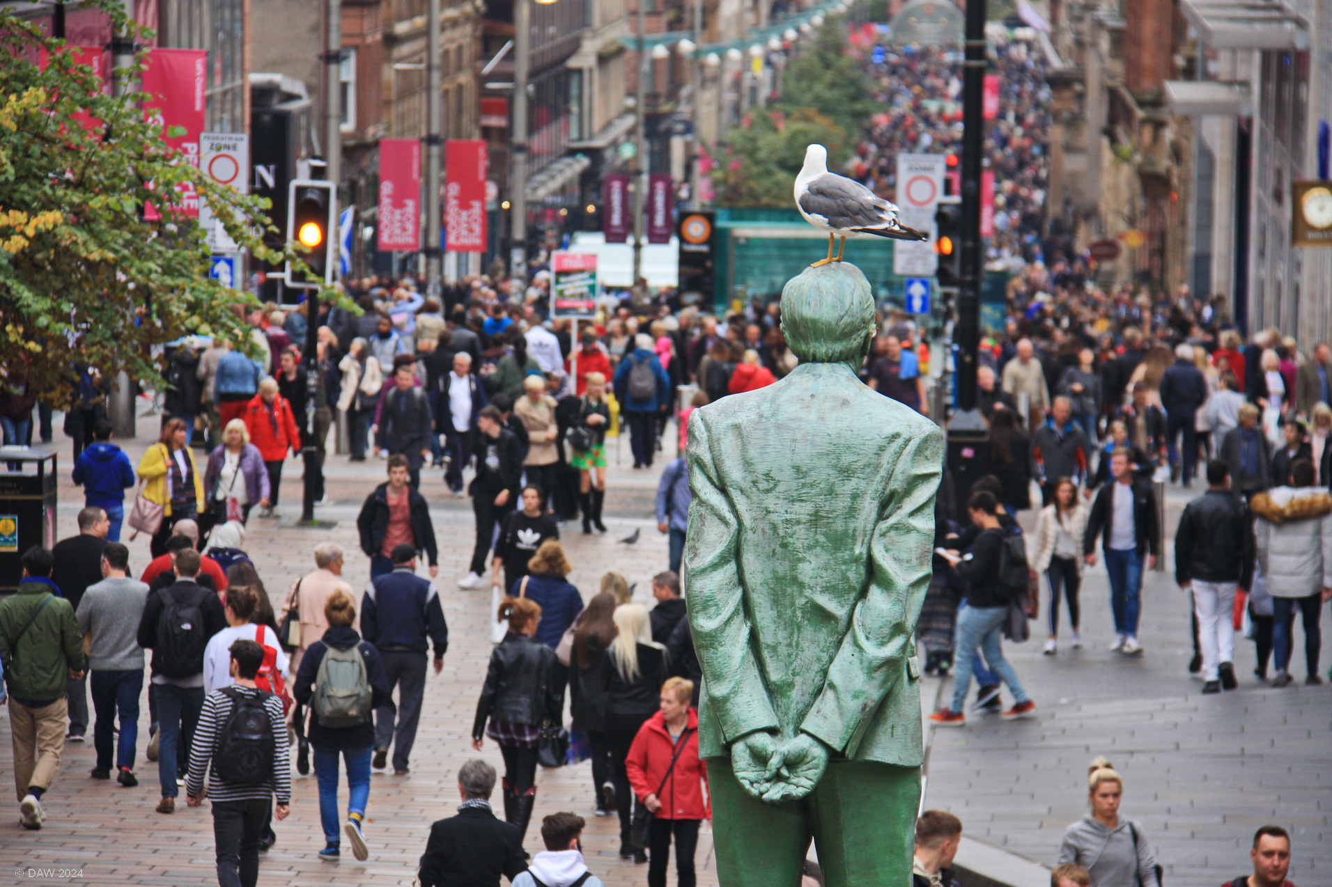 Donald Dewar and a Seagull watch over throngs of shoppers on a busy Saturday in Glasgow.