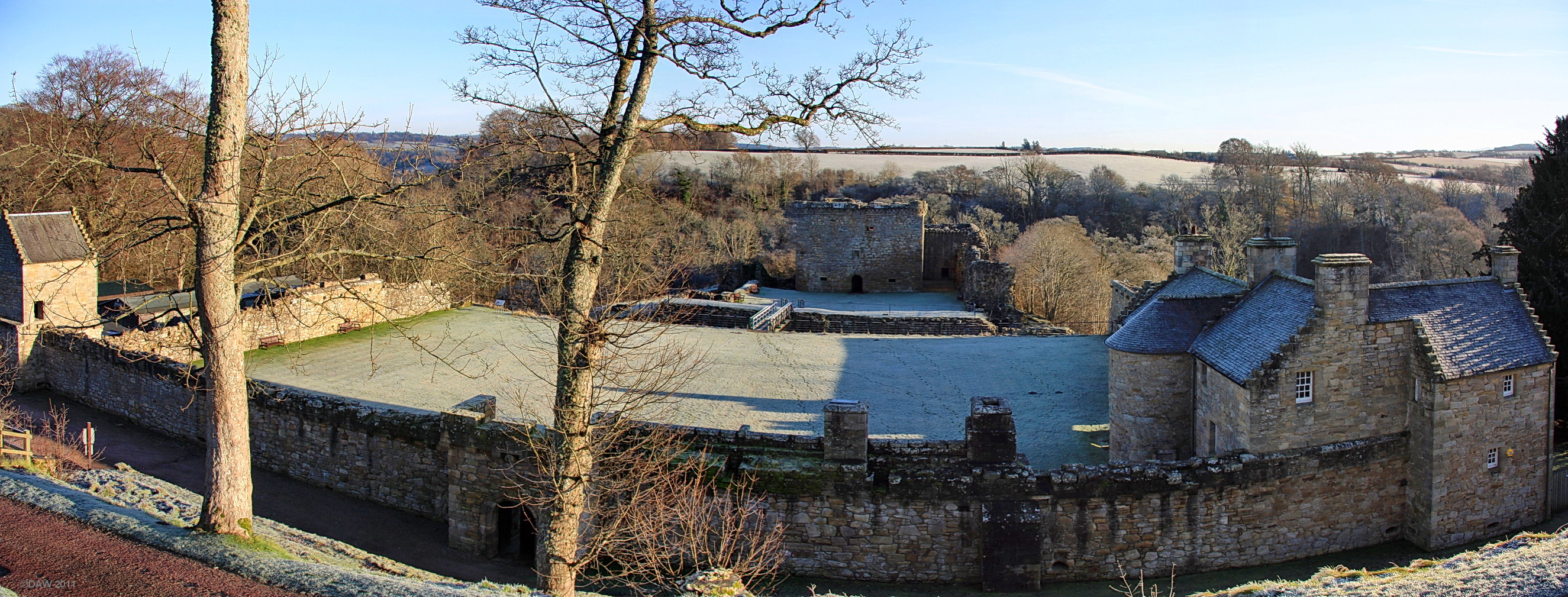 Built in 1532 it is an early example of an artillery fortification. The main tower house in in the centre of the photo behind a very deep ditch. There is a steep drop down to the river Nethan behind the tower house. The building in the foreground was built after the castle was abandoned as a fortification. Map location.