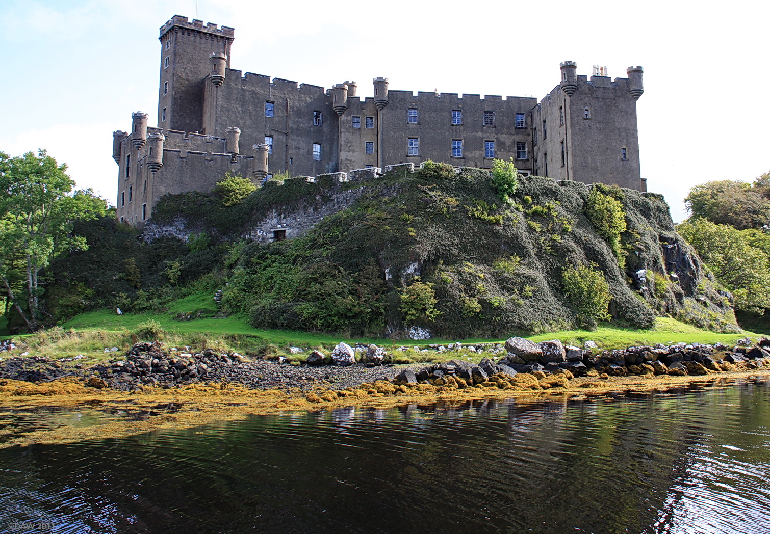 The Castle you see today is a 'romantic restoration' that was carried out by the 25th Chief between 1840 and 1850. In its early days the water of Loch Dunvegan surrounded the castle on all sides and it was only in 1748 that a landward door was created. The original sea gate can be seen lower down on left. Map location.