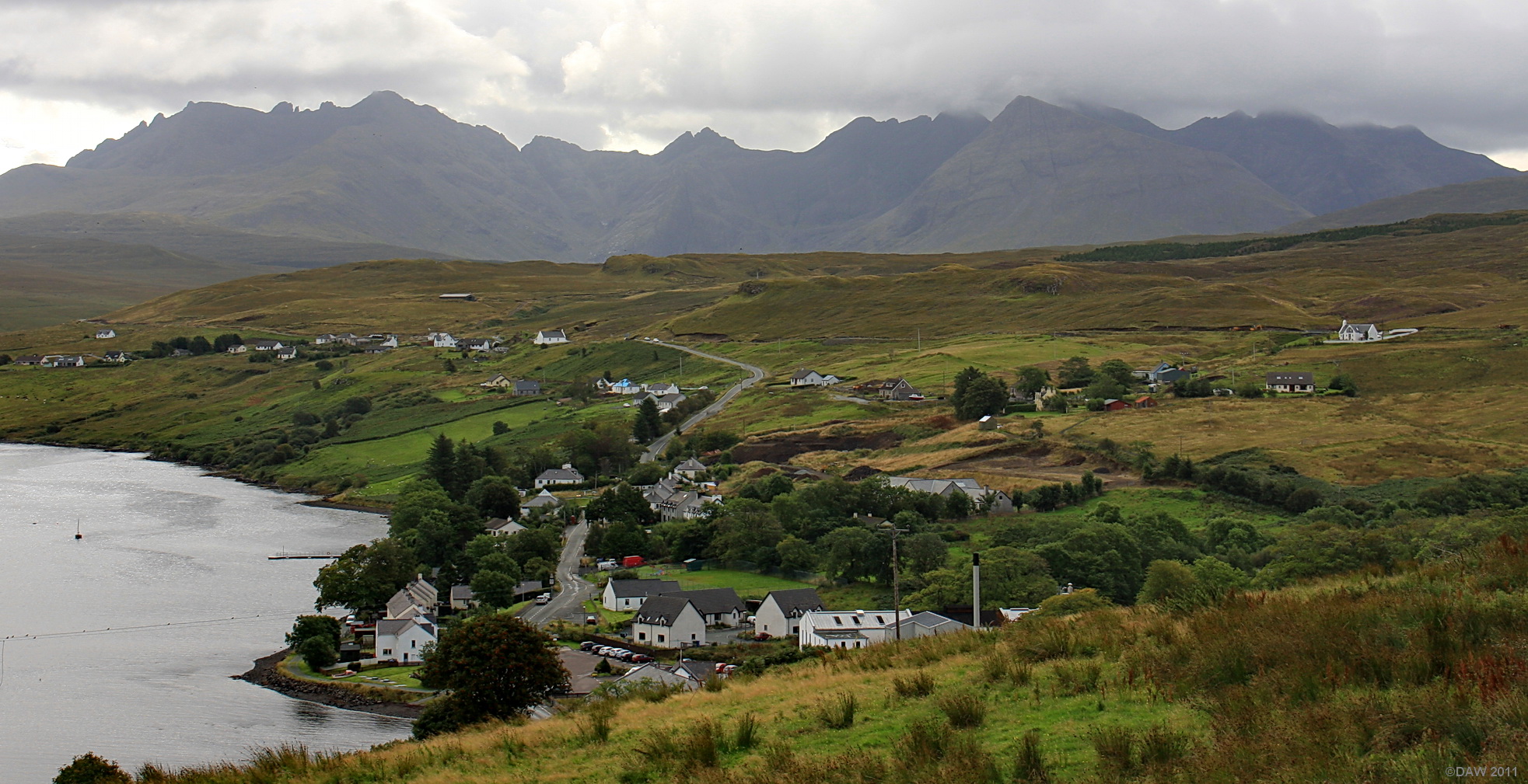 Overlooking Carbost towards the Cullin mountain range. Carbost is only a small village but is best known for it being the home to the Talisker Distillery, the chimney of which can be seen in the photo.