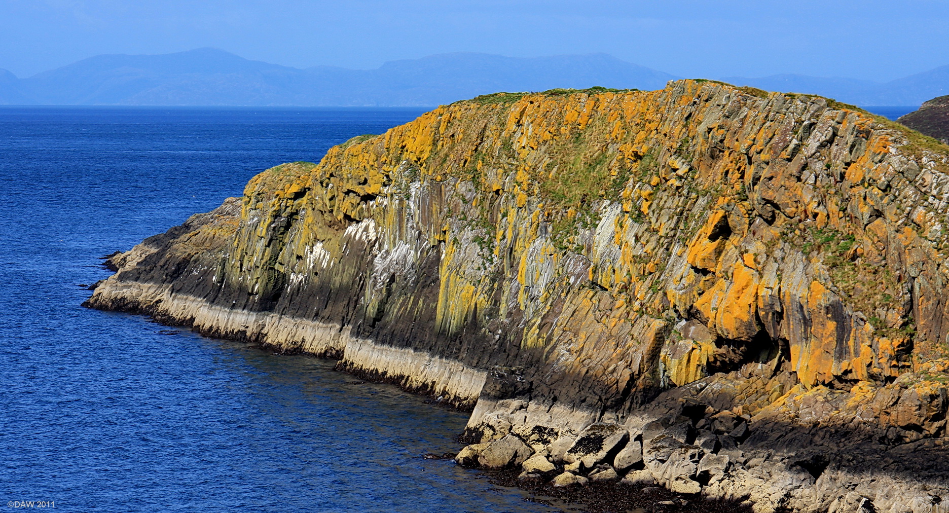 Situated off the west coast of the Trotternish Peninsula of the Isle of Skye. It looks a bit like someone has had a field day with a pot of yellow paint. The Islands of Lewis and Harris are in the distance.