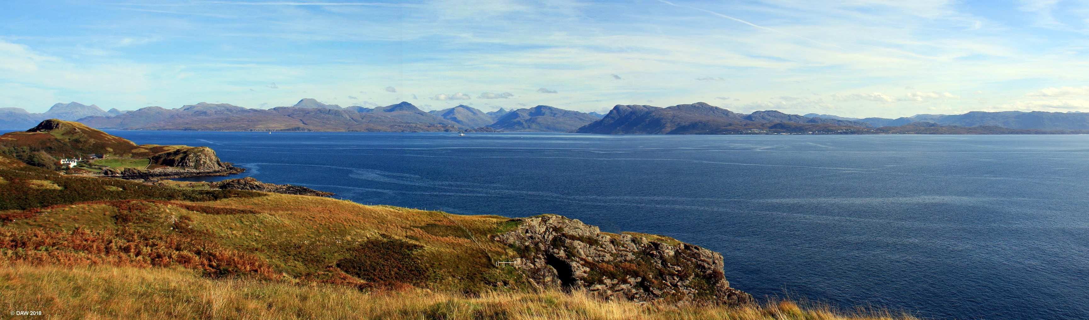 Looking across The Sound of Sleat from Skye. Towards the right the town of Mallaig can be seen in the distance.