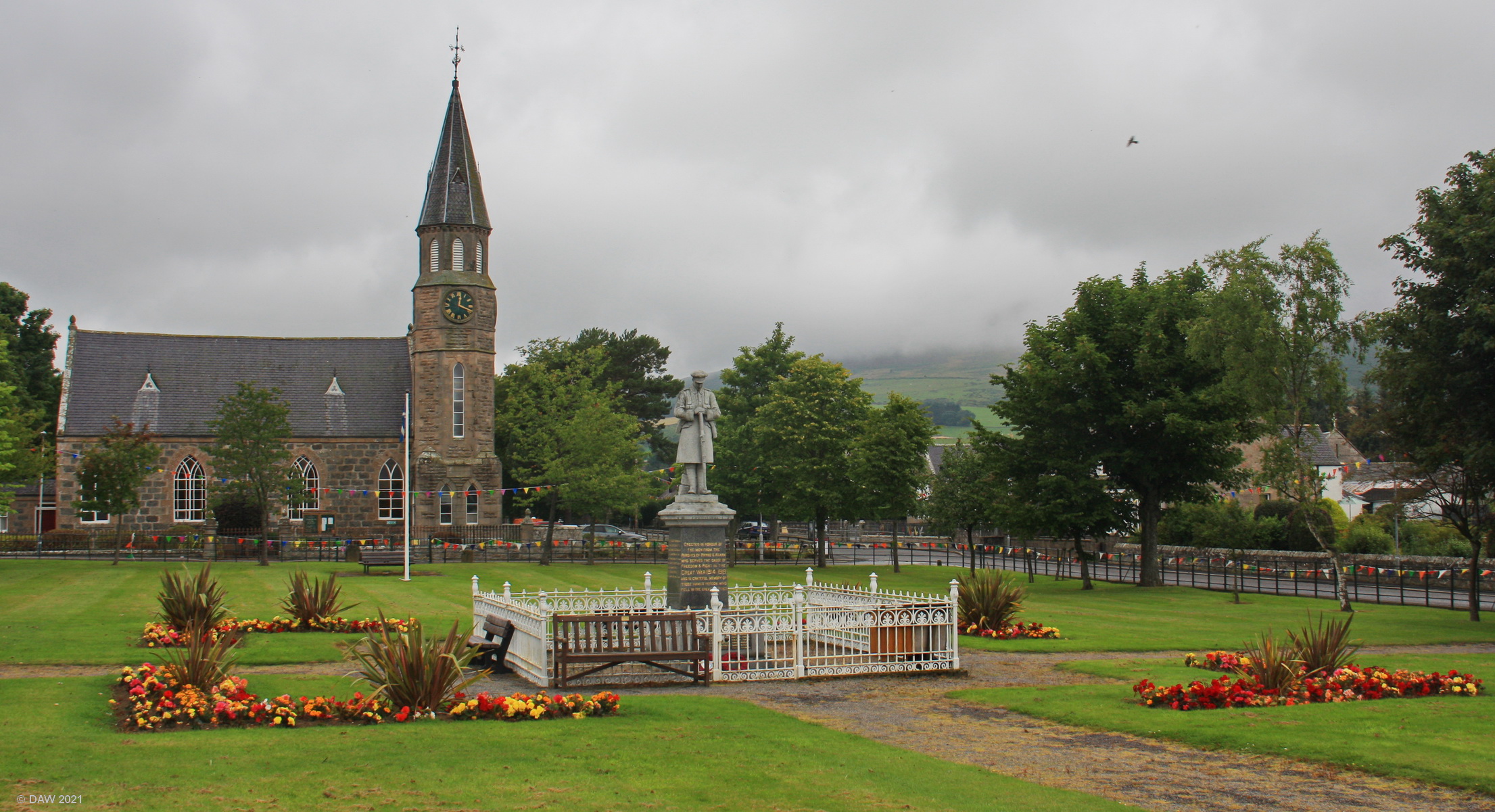 The War Memorial and North Parish Church at the centre of the small Aberdeenshire village of Rhynie.