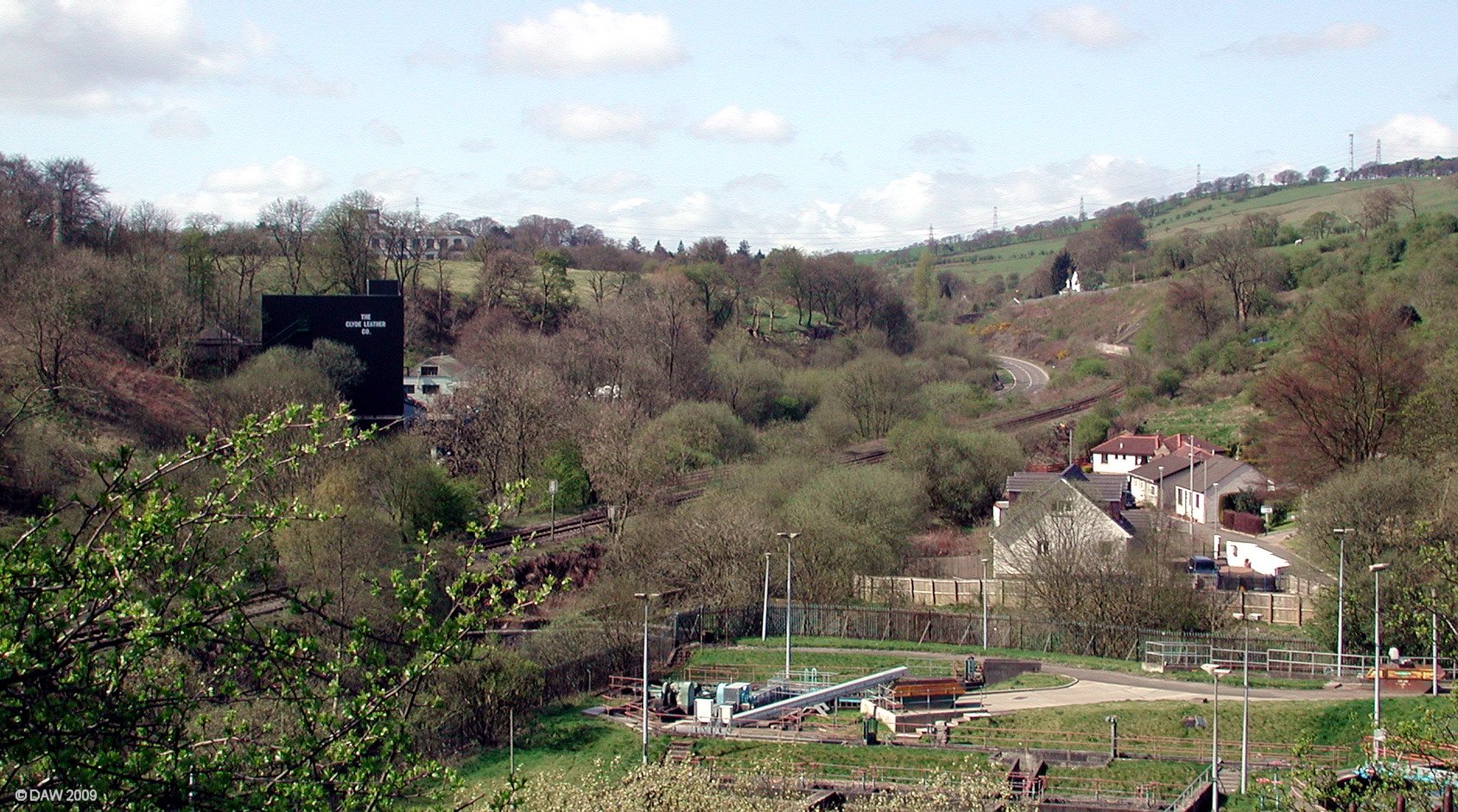 Probably not a view the tourist board would promote. The sewage treatment works are in the foreground, left of centre is Clyde Leather works which was Broadlie Mill, above that and over the hill you can see the top of the former Crofthead Mill. Neilston Low station was located just round the bend in the railway track that runs along parallel to the road. Map location.