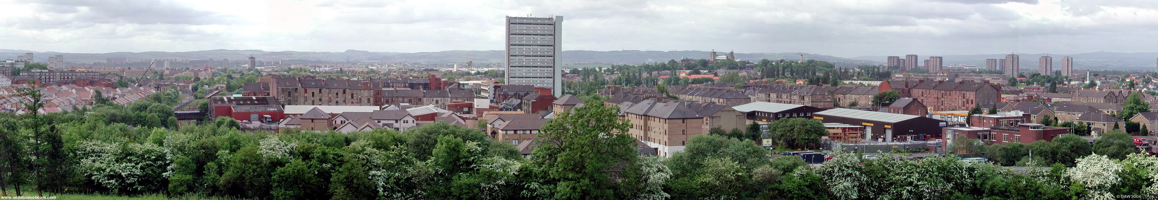 This view is dominated by the Anniesland cross tower block, to the left on the horizon you can see the familiar outline of the Neilston Pad. The Forth & Clyde Canal runs behind the tree line in the foreground.