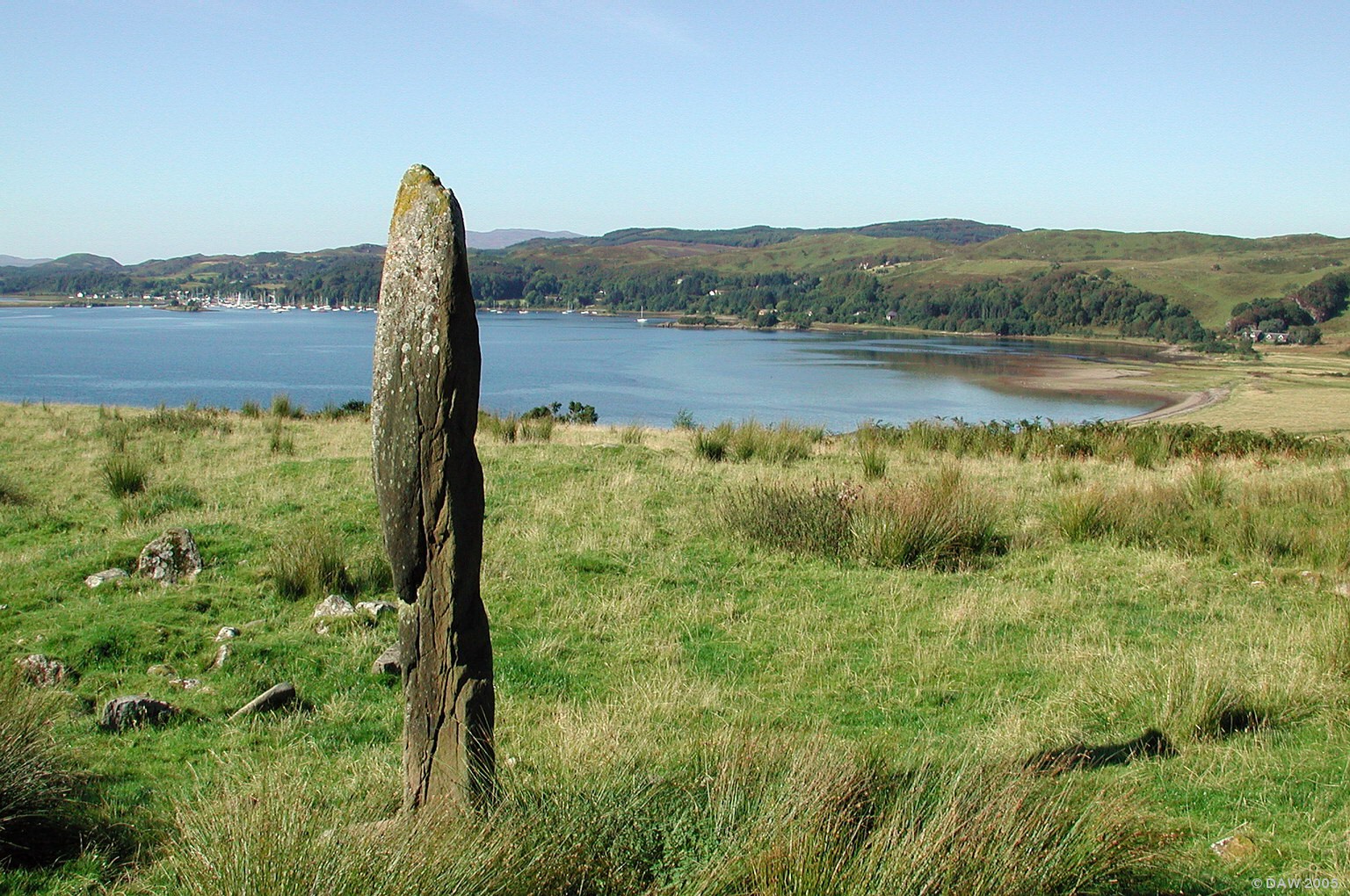 This single stone and associated Cairns stand on a hill with impressive views over Loch Craignish. The stone is thought to have had some astronomical significance but it fell over in the winter of 1978/9 and is now embedded in a concrete plinth on a different alignment.