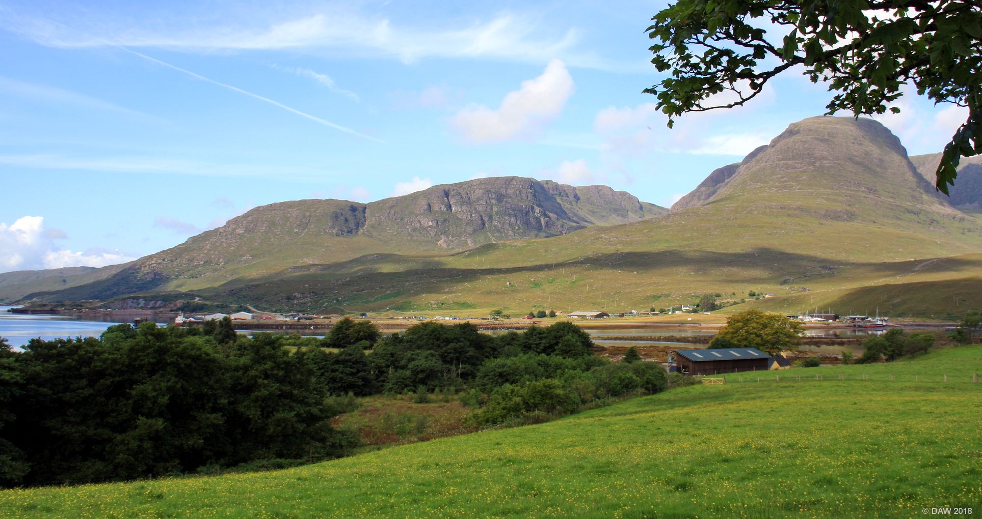 Looking across Loch Kishorn, on the right Sgurr a Chaorachain rises to some 792m. On the left at the shore you can see what appears to be cliffs. This is a dry dock constructed in the 1970's and used to construct the concrete base for the Ninian Oil field. It was only used once more to fabricate parts for the Skye Bridge. After more than 20 years it is about to have a new lease of life as the fabrication base for a new off shore wind farm.