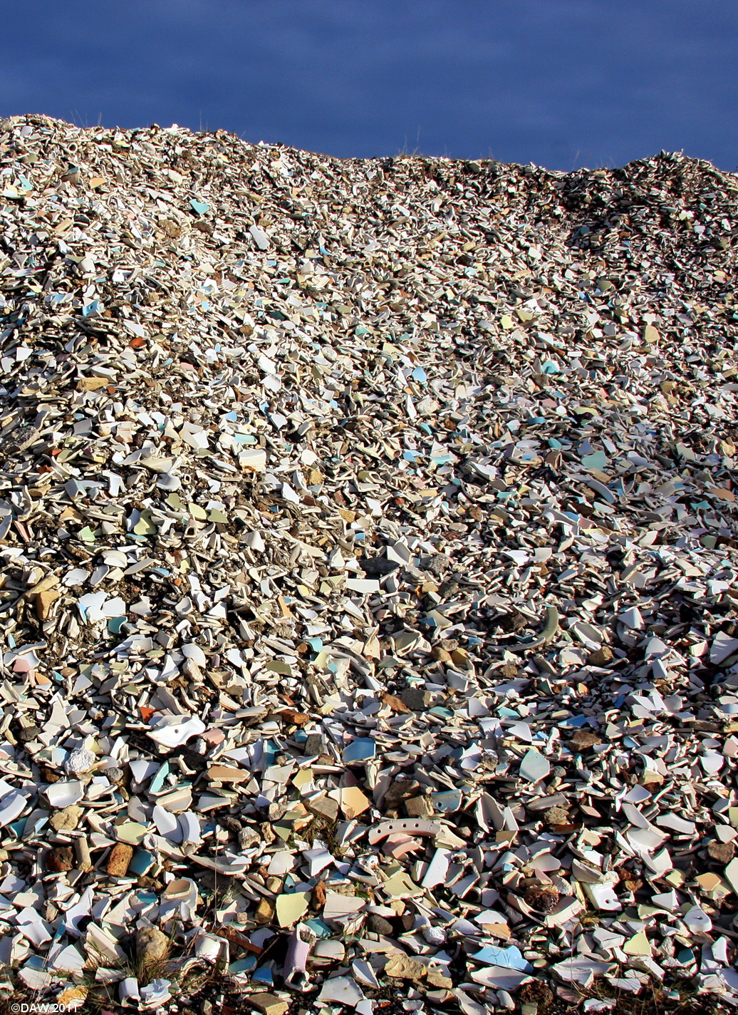 This is just one of the heaps of broken pottery at the old Shanks pottery in Barrhead. The pottery was opened in 1900 after moving from other sites around Barrhead, they remained here until finally closing in 1992 after a merger with Armitage in 1969. If you look close you're almost certain to see a colour that matches your bathroom suite. Map location.