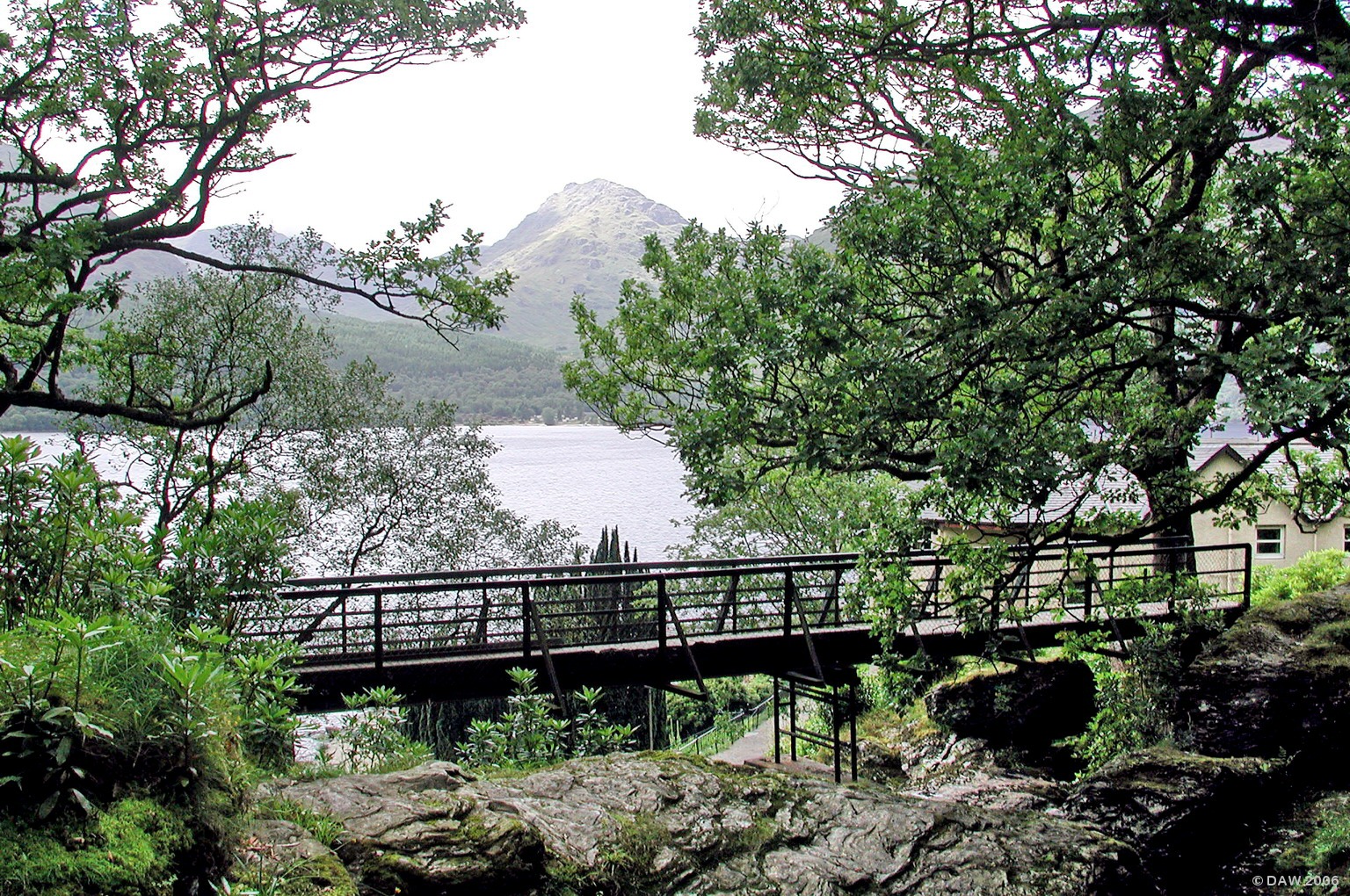 Ben Vane can be seen rising to 915m on the west side of Loch Lomond. The bridge carries the West Highland way footpath north. This is the only means of travelling up the eastern side of Loch Lomond beyond Rowardennan. The Inversnaid Hotel can be seen on the right, it can be reached by passenger ferry from Inveruglas or by a long single track road. Map location
