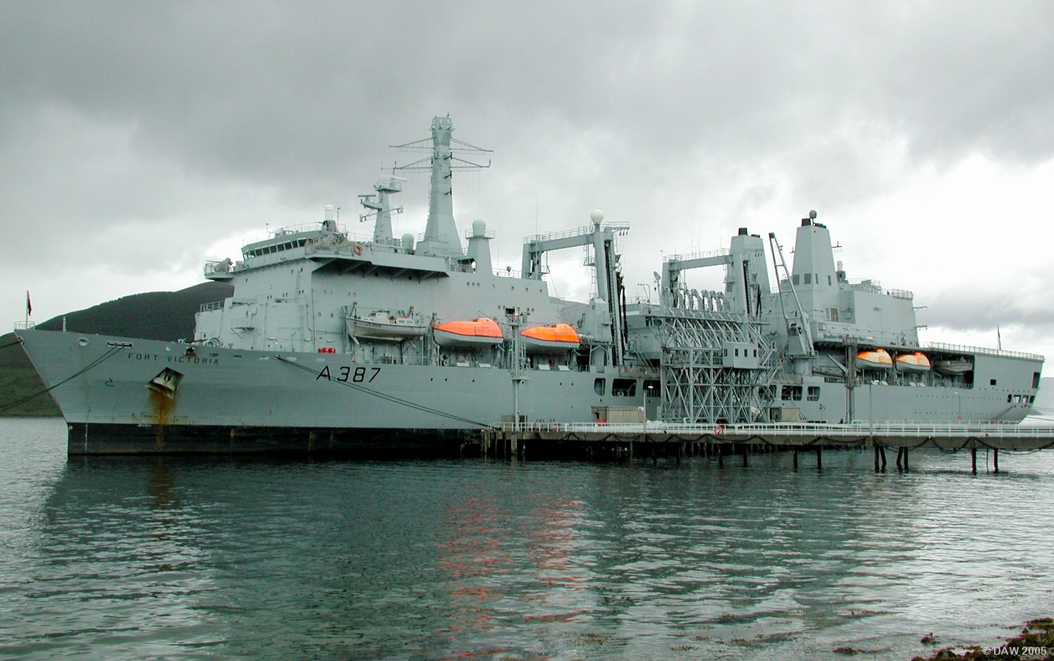 The Fleet Replenishment Ship, Fort Victoria, entered service in 1994. She displaces some 31,565 tons and has a length of 204 metres. She can carry up to 6,250m? of solids stores plus 12,500m? of liquids. She is better armed than her predecessors, a Phalanx CIWS can be seen above the bridge and also above the helicopter hanger at the stern.