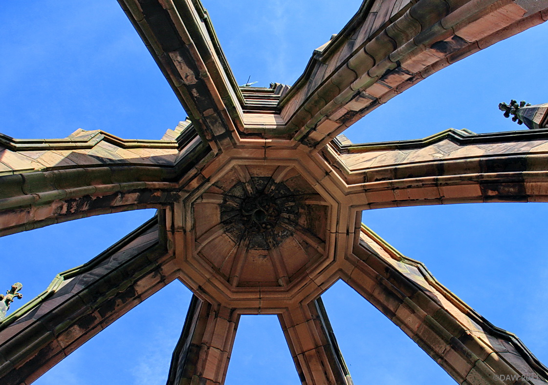 Looking from directly underneath the Crown on top of the spire of Coats Memorial Church. The spire rises to a height of 240ft above sea level and the platfrom below the crown gives a tremendous view of Paisley town centre.