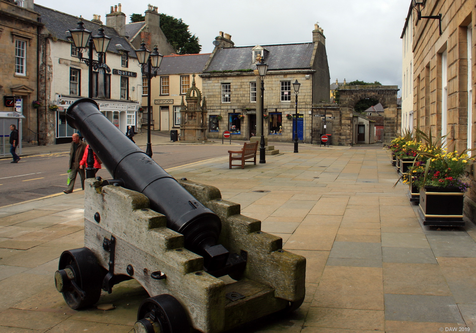 The town centre of the Aberdeenshire coastal town of Banff. There has been a settlement here since before the 12th century, in 1372 Royal Burgh status was granted by King Robert II. The Biggar Memorial drinking fountain can be seen in the background. Map location.
