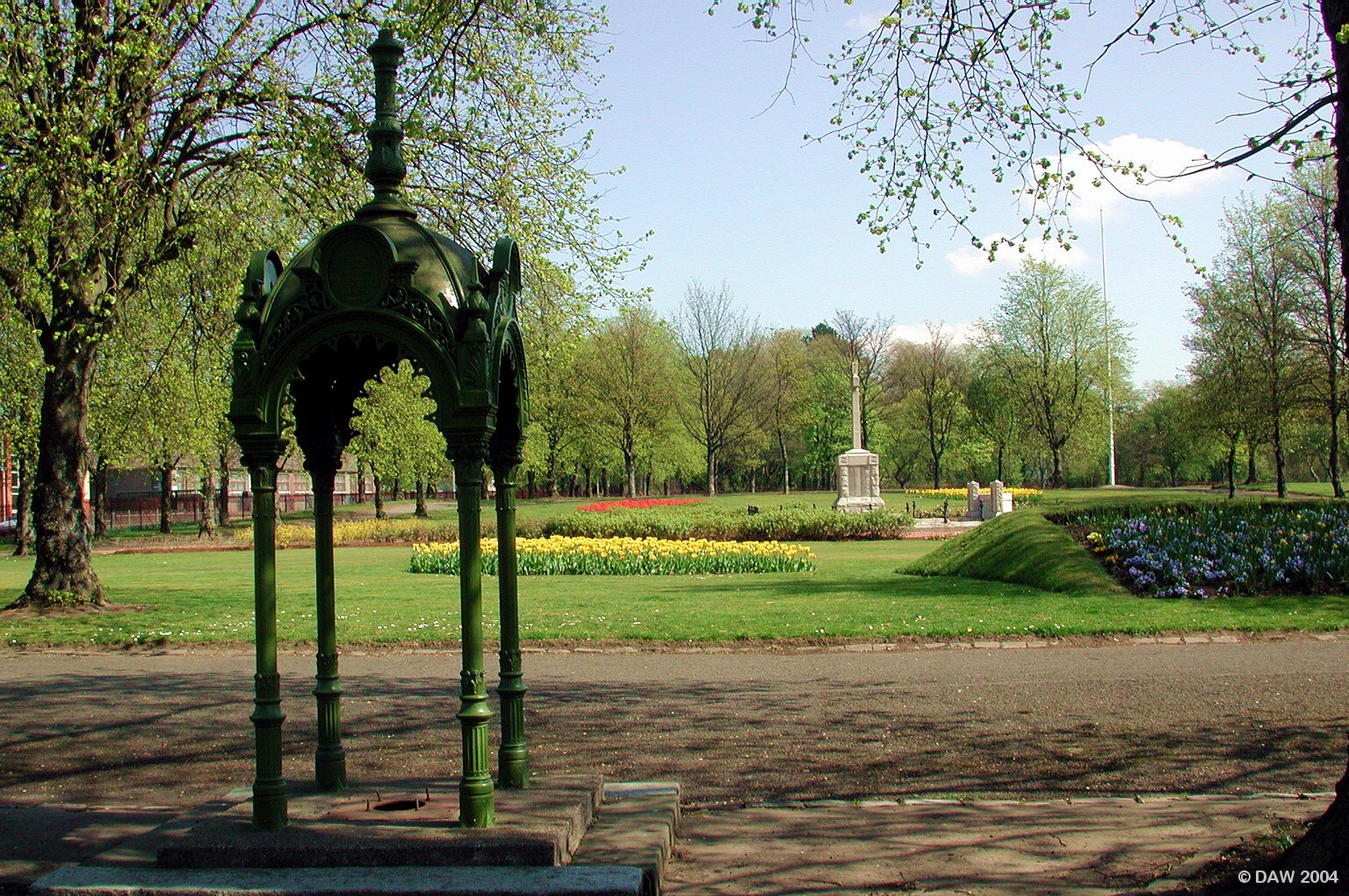 Looking towards the War Memorial in Cowan Park.  Named after local man James Cowan who left £10,000 for the construction of a public park.  Land at the East of the town was chosen in 1910.  From 1909 to 1911 the playing fields were used as Barrhead Aerodrome.