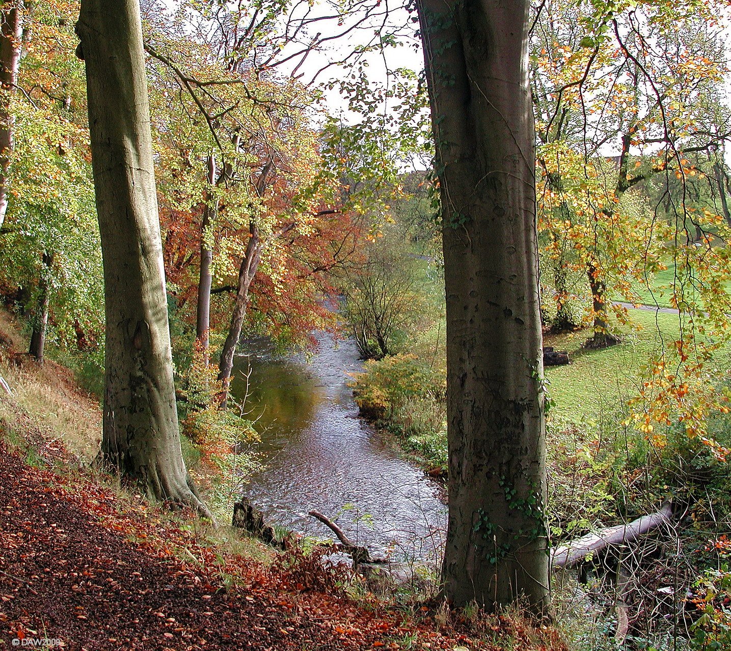 Over looking the Levern burn in Autumn. Just round the bend was the site of the Levern Mill which once employed as many as 1000 people, many of them children. The mill was orginal power by the water of the Levern but when the Dunlops took it over it was converted to steam power. Mp location.
