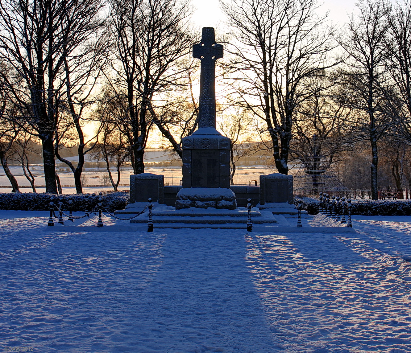 A winter view of the War Memorial in Cowan Park, Barrhead.