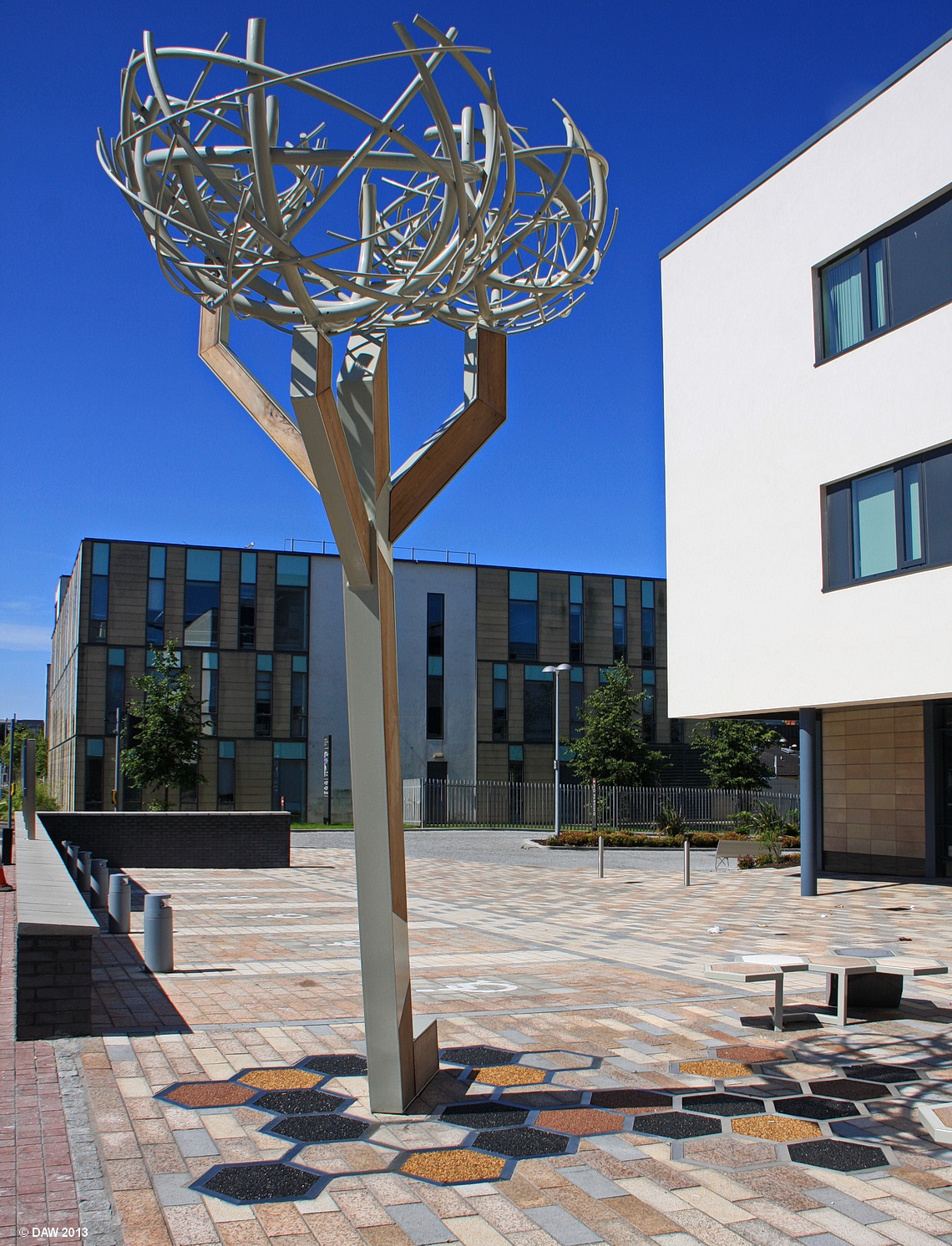 Sculpture outside the new Barrhead Health and care centre. The Sculpture is the work of Glasgow based Iain Kettles and Susie Hunter and is said to depict a tree with nests.