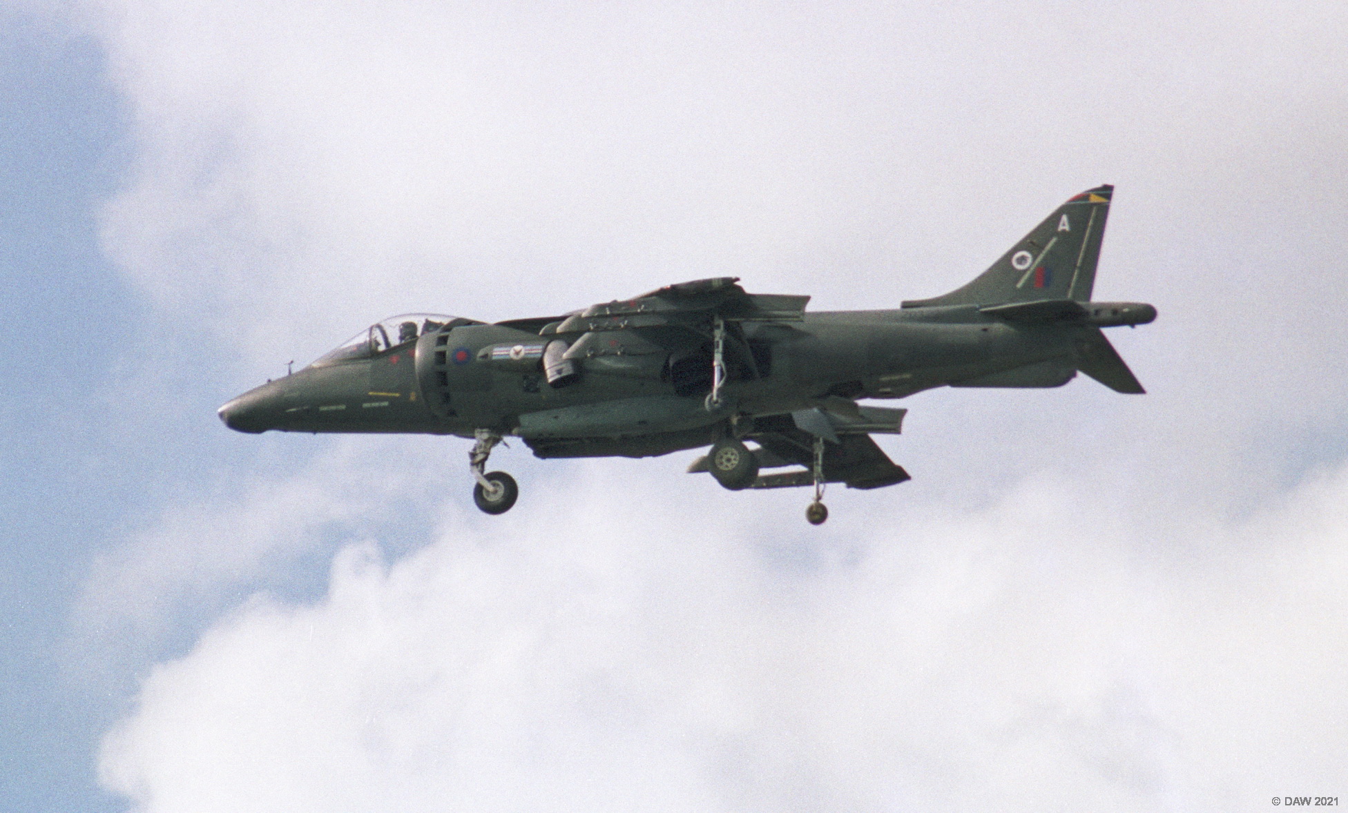 An RAF Harrier hovers during an air diisplay at Fairford. The Harrier first entered service in 1969 as a ground attack and reconnaissance aircraft with vertical/short takeoff capabaility. It was the only aircraft of that era with that capability. It was later developed in to the Sea Harrier for use with the Royal Navy's Invincible Class light Carriers.