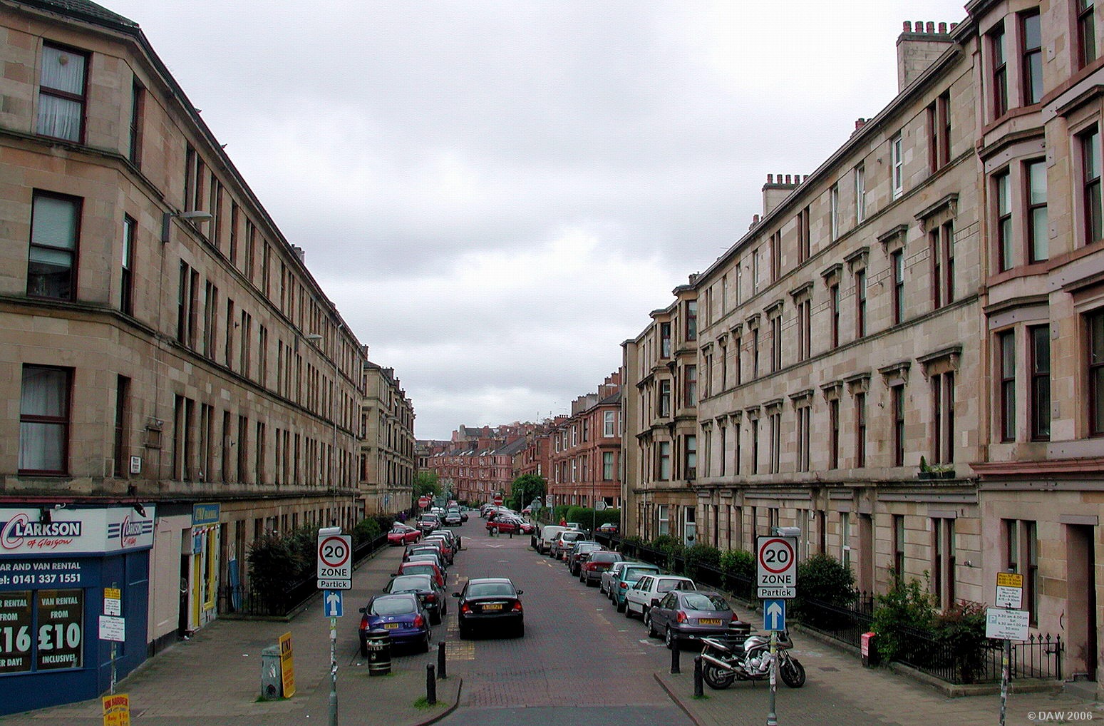 If you turned the clock back 100 years little would change in this view other than the parked cars. This street is typical of 3 and 4 story sandstone tenemant blocks in Glasgow. During the 1980's large grants were given to enable this type of housing to be re-roofed and 100 years of grime cleaned from the sandstone, bringing back the red and yellow colours of their former glory.