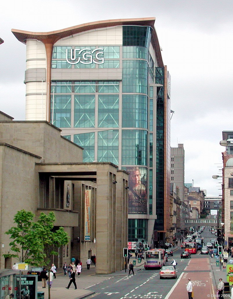 This building was apparently voted least favourite building in Glasgow in 2004 when this photo was taken. Its main claim to fame when it was opened was that its was claimed to be Europe's tallest Cinema Building. The adjacent building with the pillars is the rear of the Royal Concert Hall.