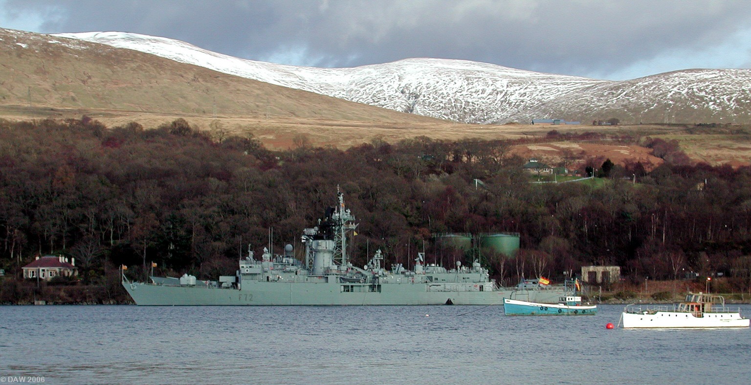 The Andalucia and friend pay a visit to Faslane in 2000.  Foreign warships are not uncommon at Faslane, especially those from NATO countries.  The Andalucia was built in Spain in 1971 but is a modified American "Knox" class frigate.  Power by 4 steam turbines and armed with Harpoon, anti-submarine rockets and a 127mm main gun amongst other things. She was decomisioned in December 2005.