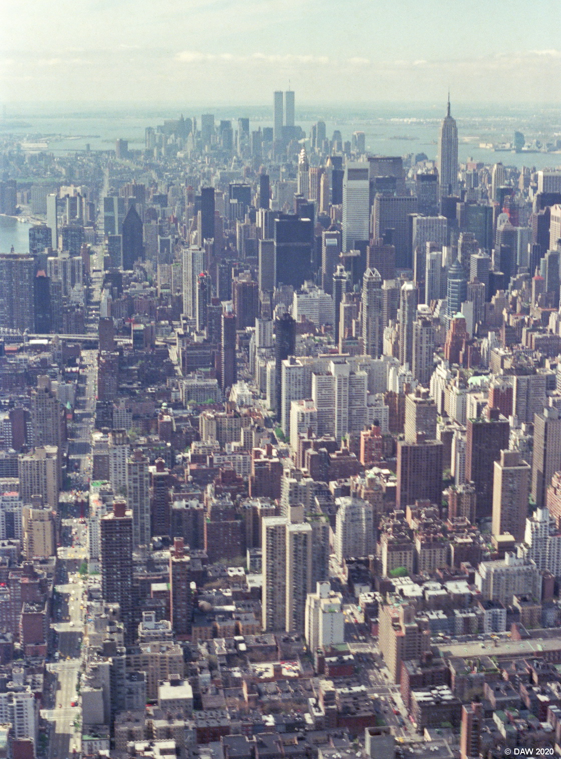 A view from above Upper Manhatten looking south. On the left is First Avenue taking a straight line down to the south end of Manhatten. The Empire state is on the lright and the Twin Towers are in the centre in the distance.